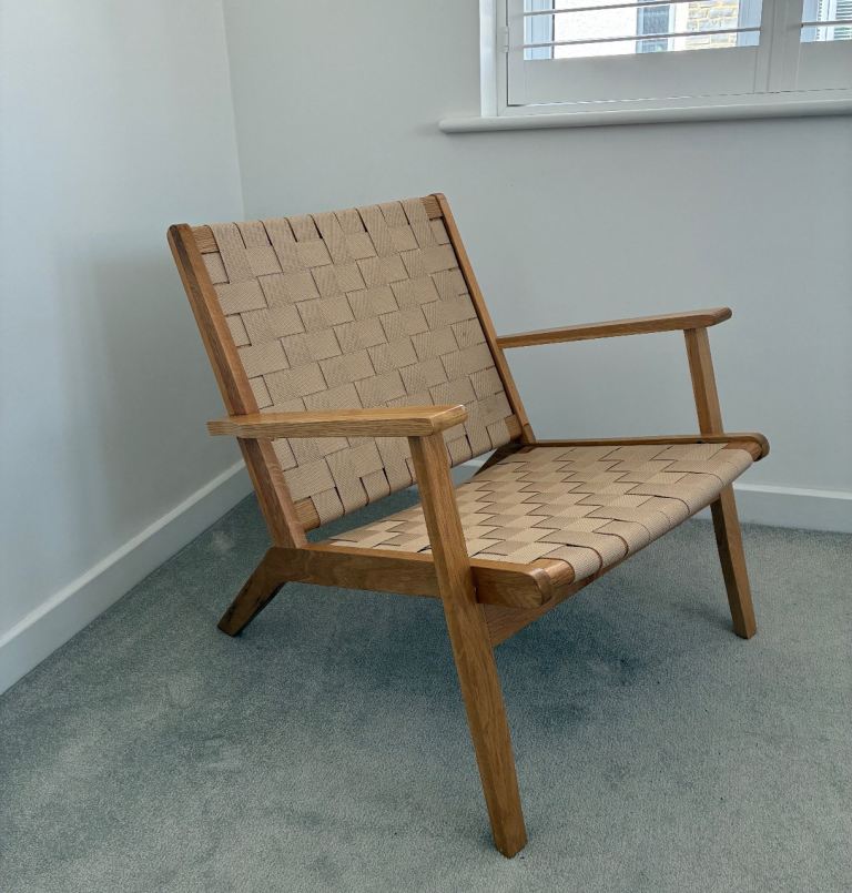 Approximate measurements are 34 ⅛” (86.5cm) tall, 17 ⅜” (44cm) wide and 22” (56cm) deep, with a seat height of 17 ½” (44.5cm) and seat depth of 14 ¾” (37.5cm).