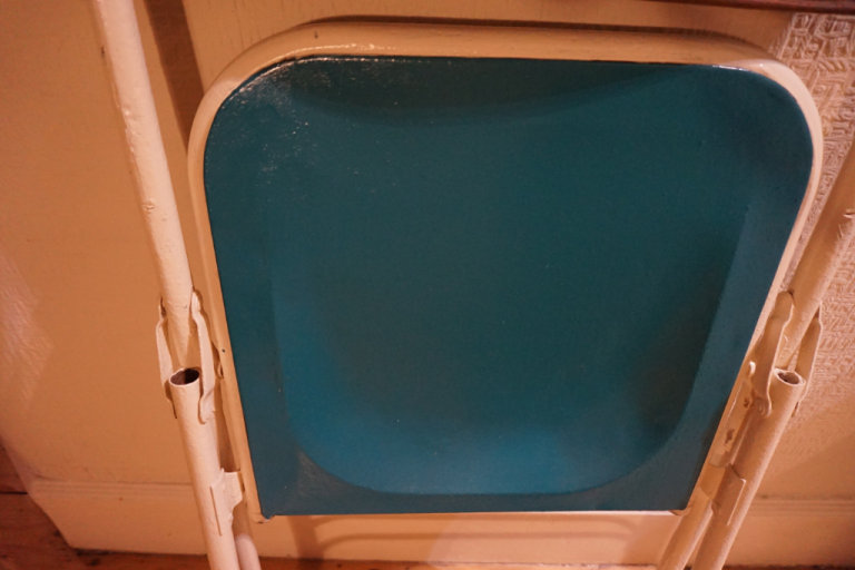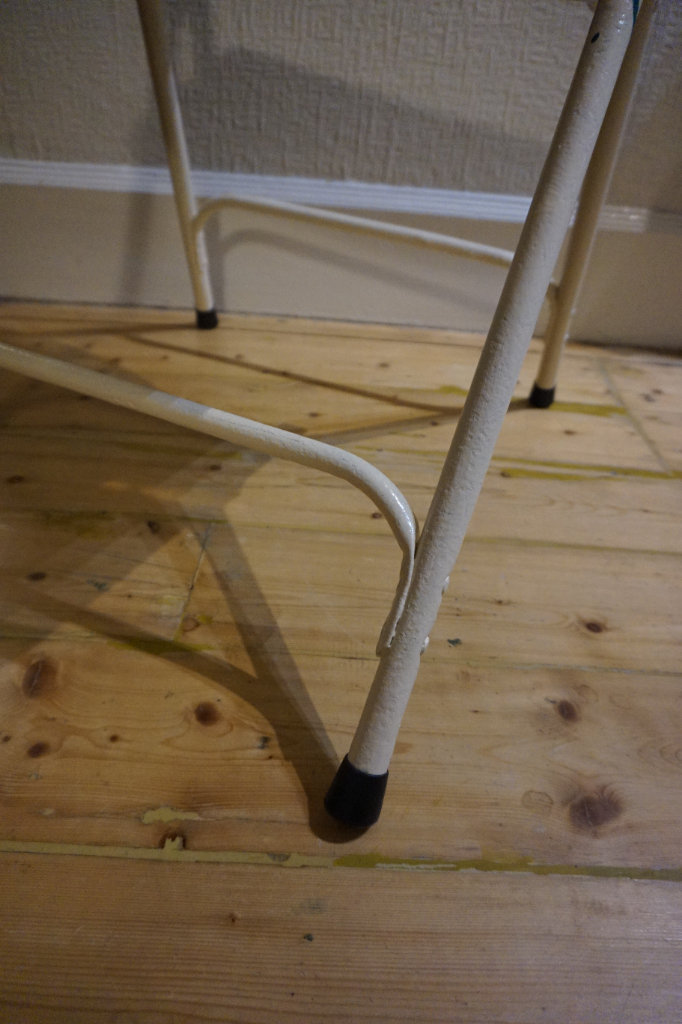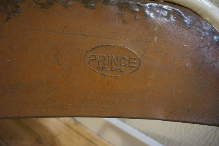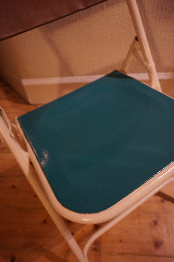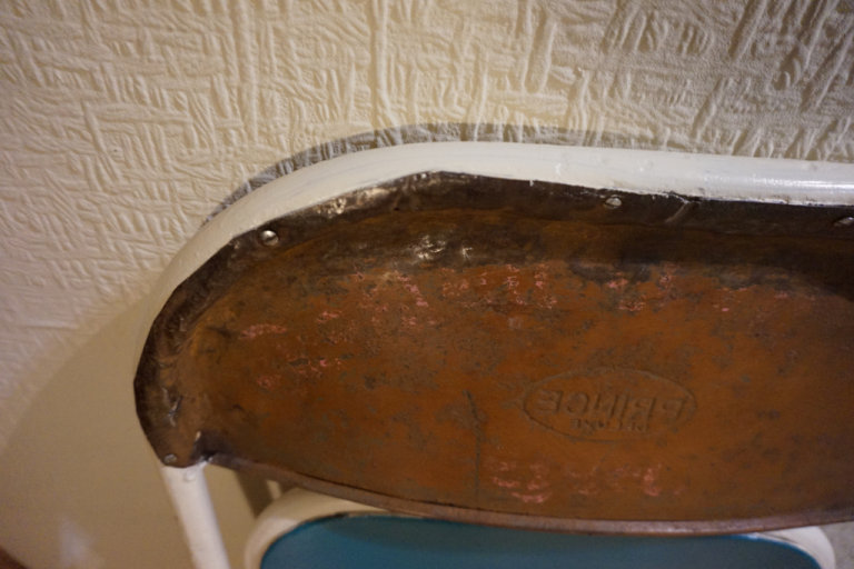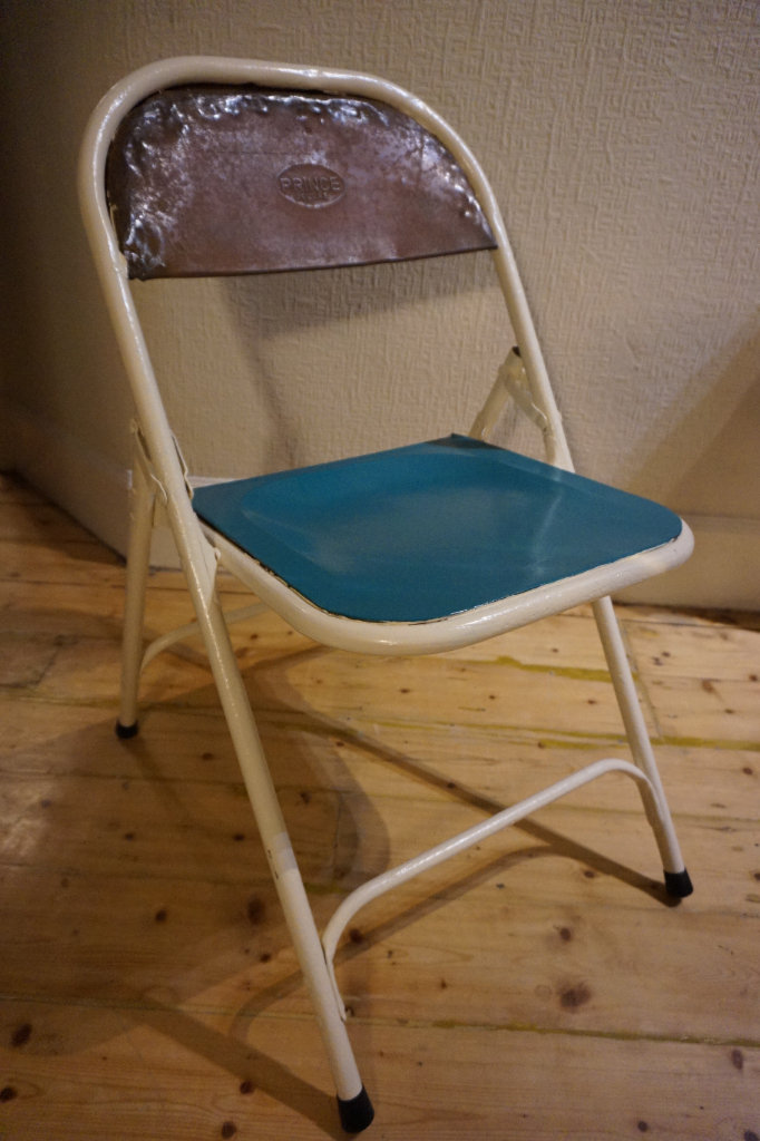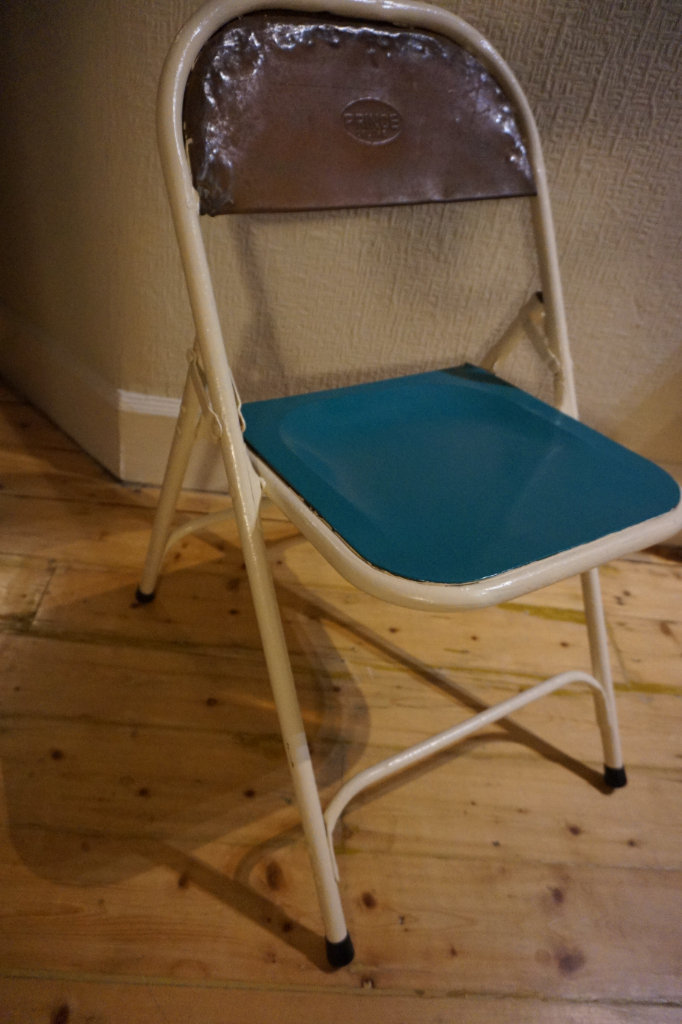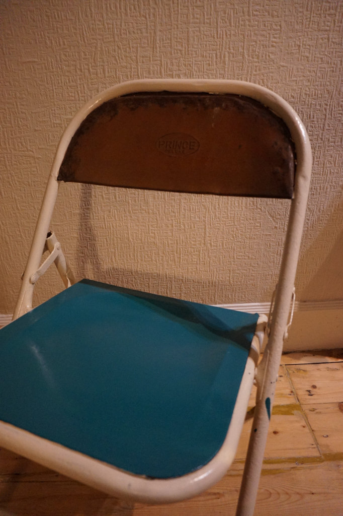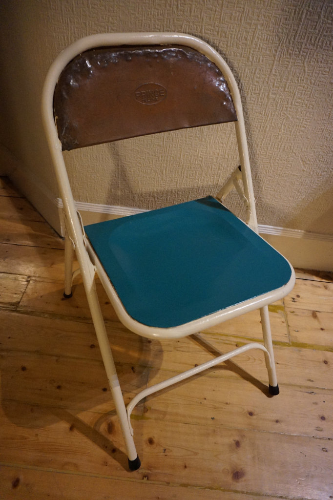Folding with metal seat in teal and cream enamel. Stamped with a 'Prince delux' logo.