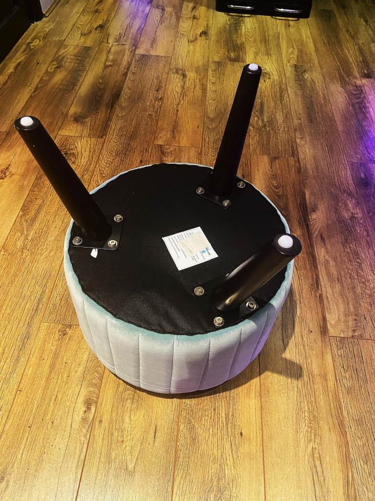 Stylish and modern round velvet footstool in a teal / soft duck egg blue colour with vertical channel stitching and sturdy angled dark wood legs. Adds a touch of luxury to any space – perfect as an accent piece, footrest, or even occasional seating.