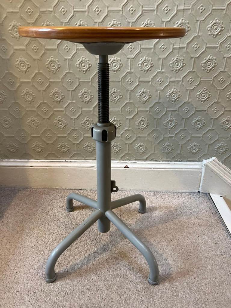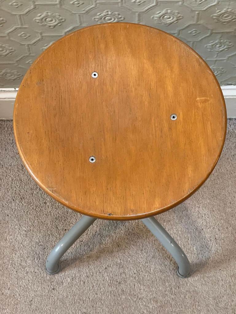 Very nice vintage industrial / machinist adjustable height swivel stool. The stool has a wooden seat and a grey painted tubular metal frame - very sturdy. The stool is adjustable in height and can swivel. It is of European design and was acquired from Luxembourg - stool possibly French / Belgian or German origin). Nice vintage condition with some marks / scratches, but overall condition very nice. Fully functional.