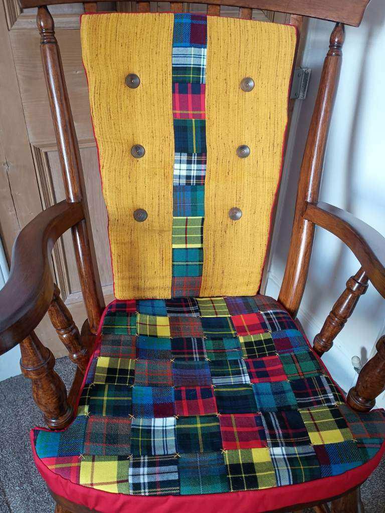 Solid, stained wood with custom-made seat pads (removable with simple ties shown in photo).