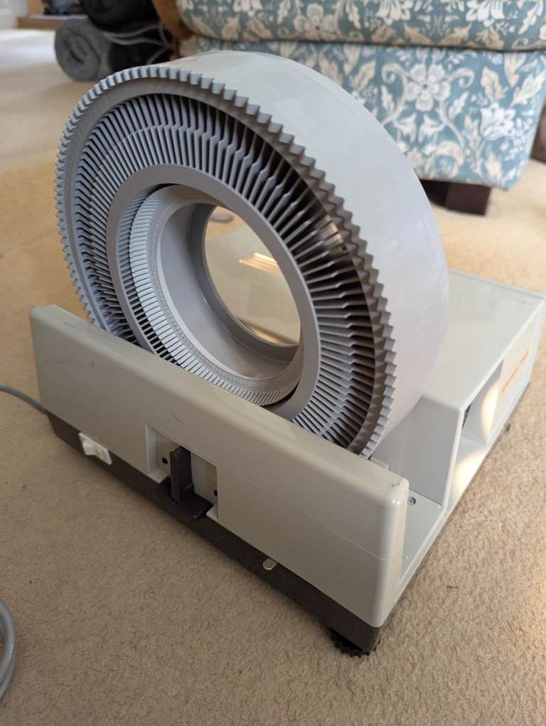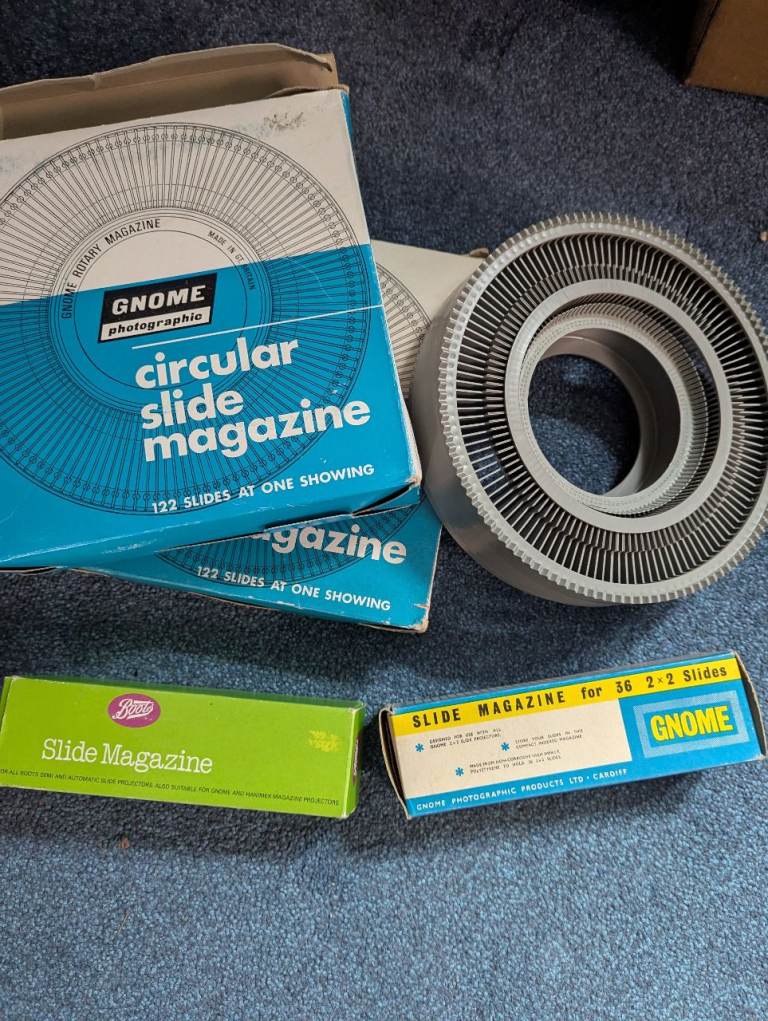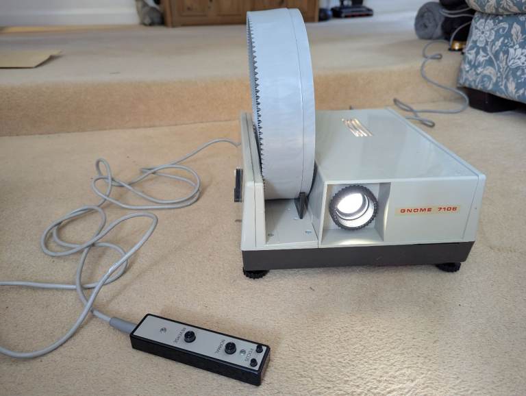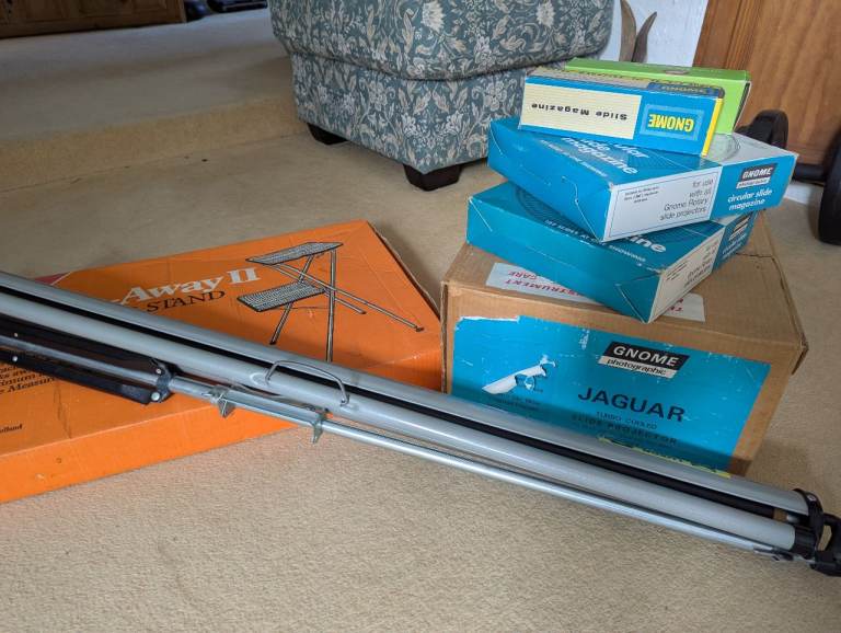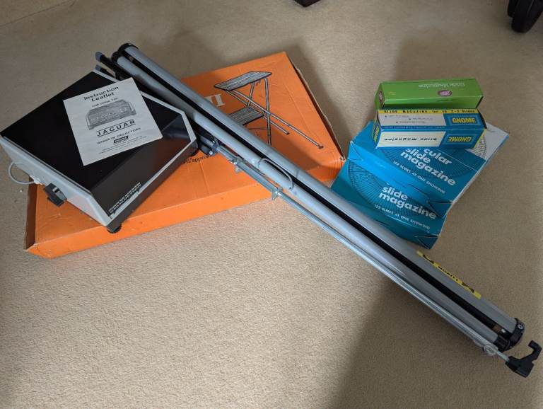 A bundle for slide viewing. 7106 Jaguar projector. Working condition, though remote control not working. Comes with rotary magazine locators. Luxor projector screen - 95cm square with tripod legs. Projector stand, with 2 shelves. Top can be adjusted by angle. 107cm high. 2 rotary cassettes holding 122 slides and 2 straight cassettes holding 36 slides.