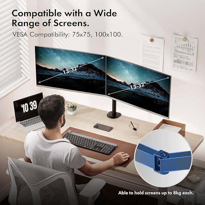STRONG & STURDY: Constructed from durable metal, your heavy duty dual monitor mount will improve your home office for years to come, with a generous 8kg max weight capacity per screen.