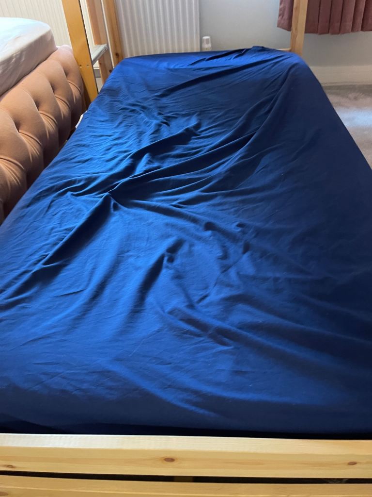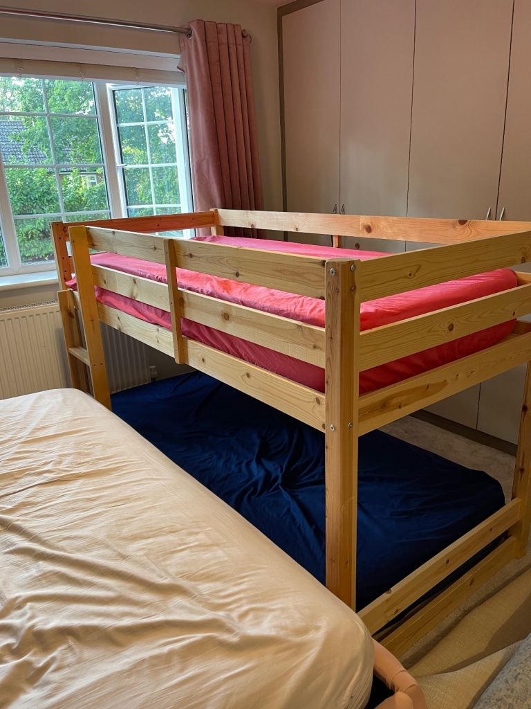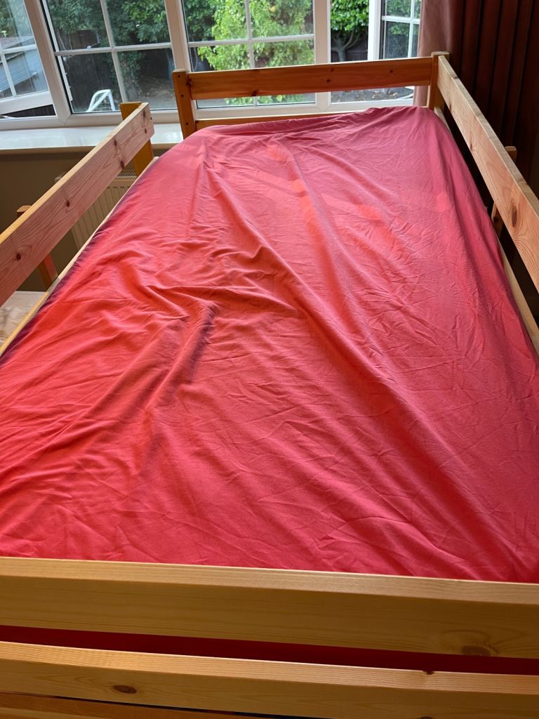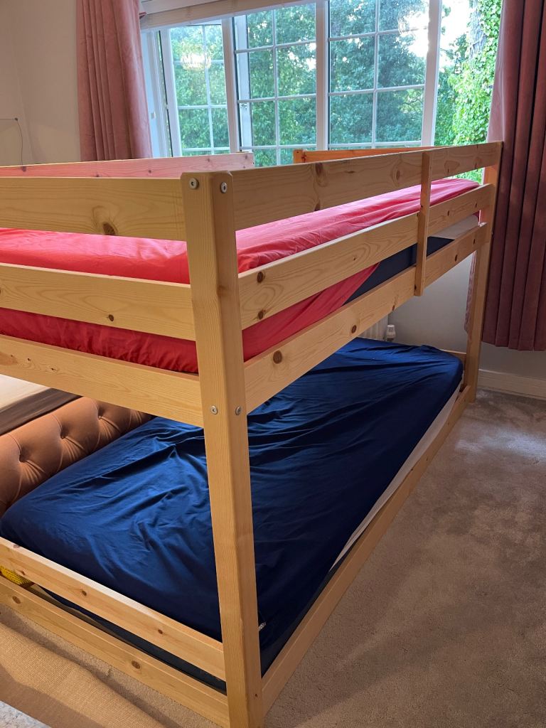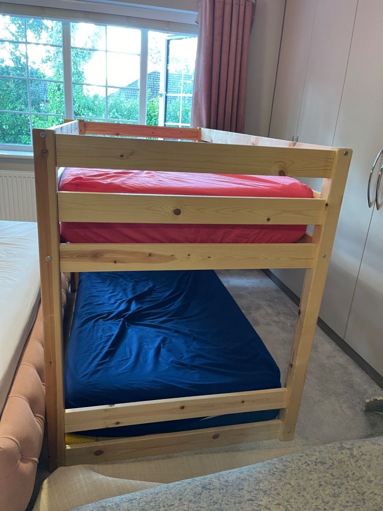 Used bunk bed frame - optionally available with 2 mattress, 2 mattress covers, 2 pillows, 2 single duvets, 2 single duvet covers.