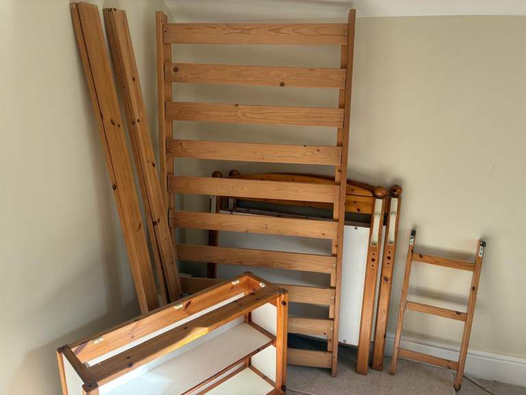A well used children’s bed, made of solid pine, has a shelving cabinet to fit under the bed. Still in very good condition despite the age. Please note, it’s not high enough to put a desk underneath.