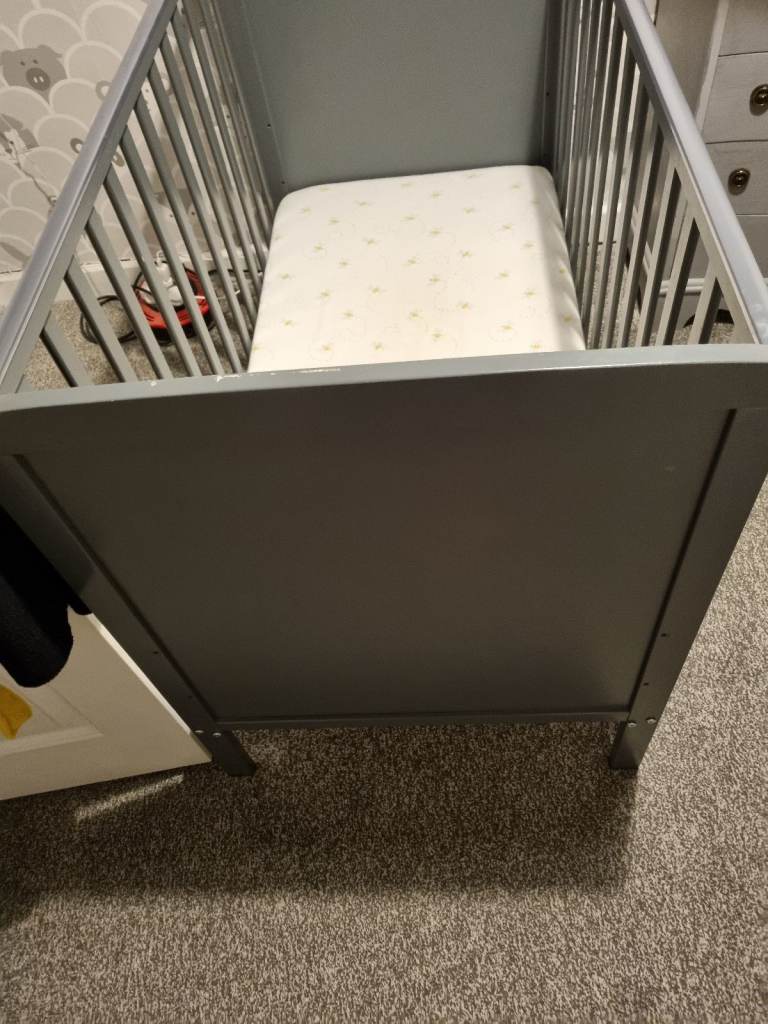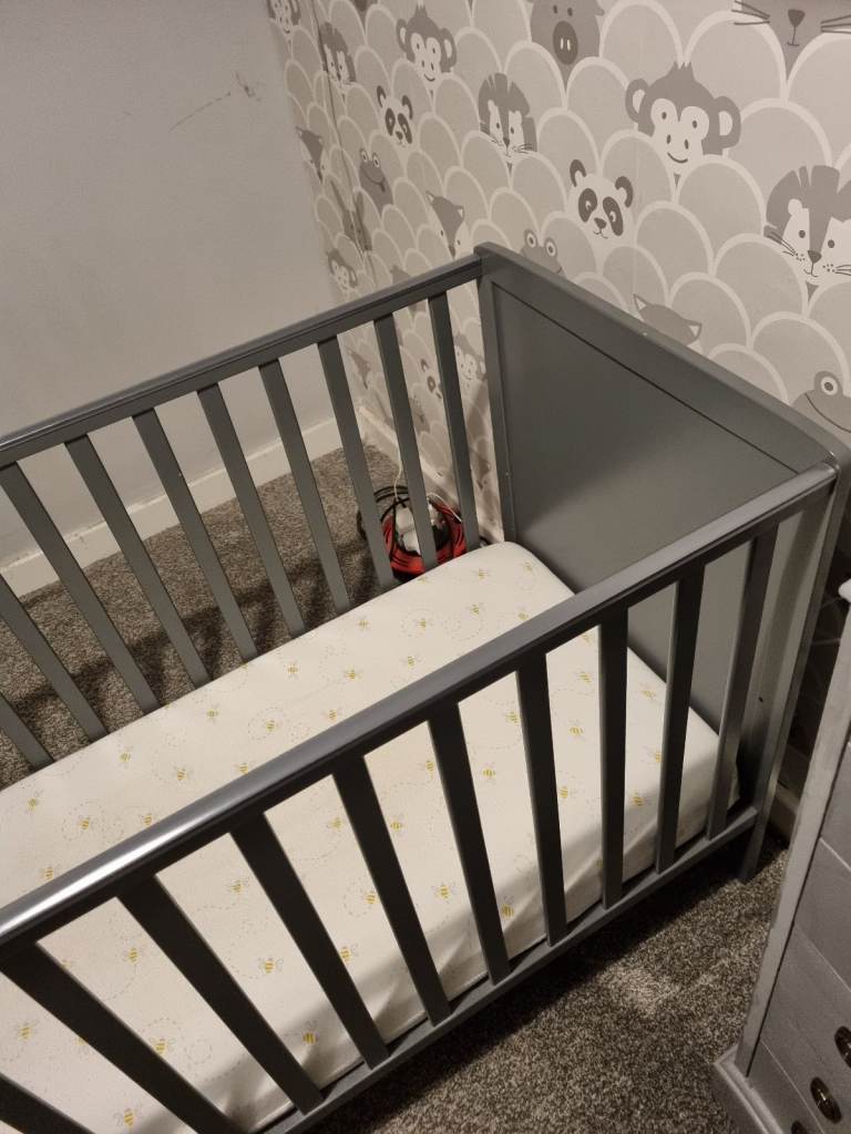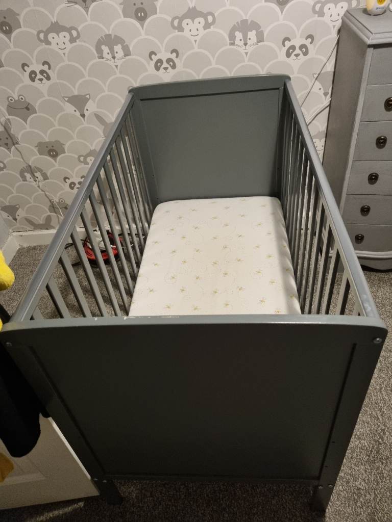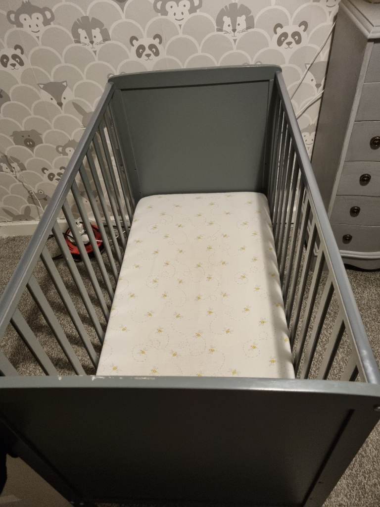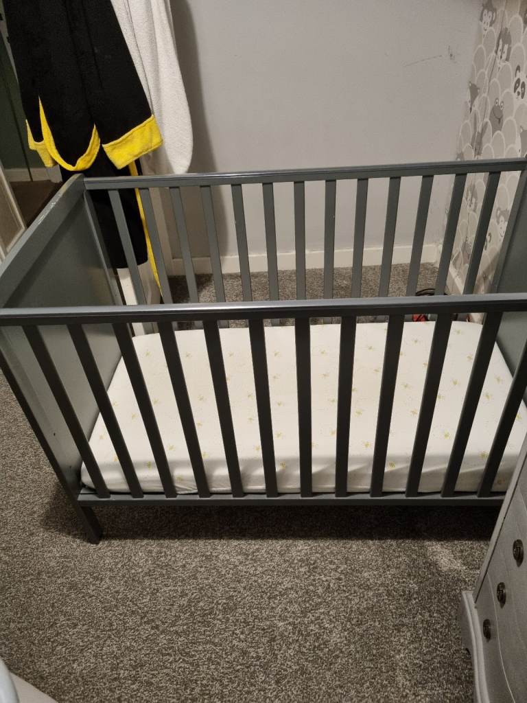 A lovely grey wooden cot. Teething rails to protect teeth. Mattress included. Suitable from bith until 3 years old. 3 height adjustable stages for growing baby. Brought from Symths. Full height details and description on last few pictures. Some marks on the wood as pictured. Mattress in excellent condition. No stains. Cot and mattress used for approx 2 years. I do have bedding for sale separately on my page. Cash in collection only.