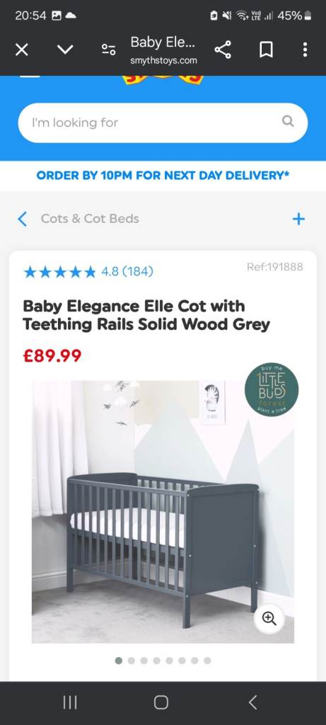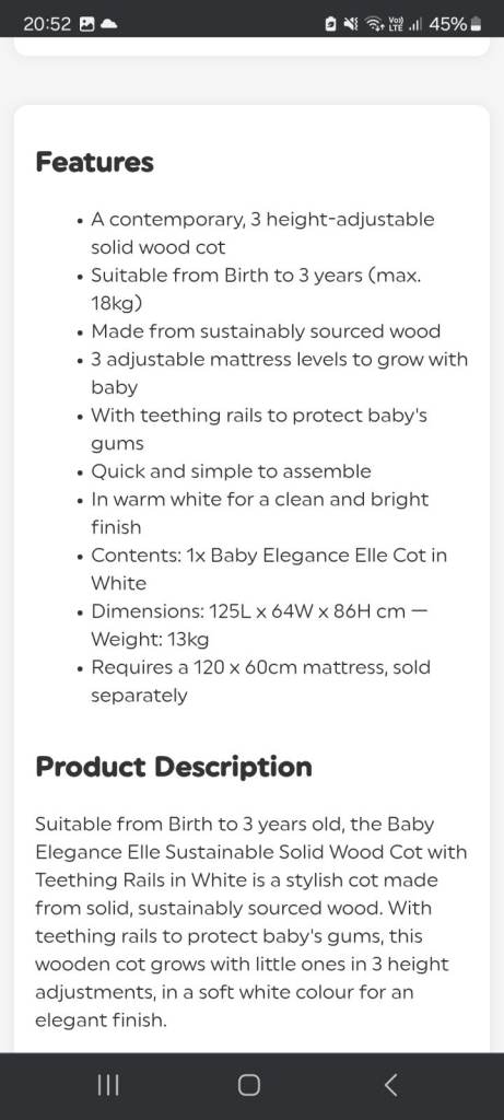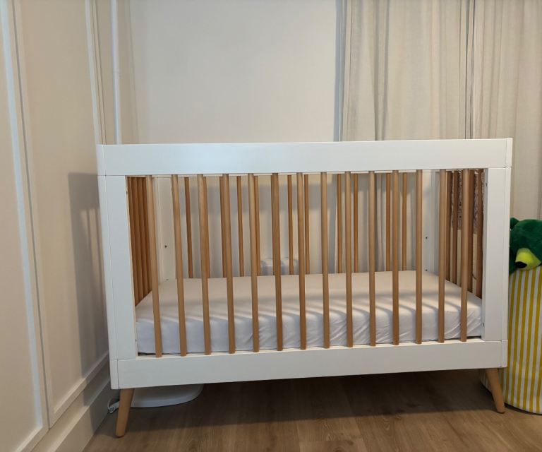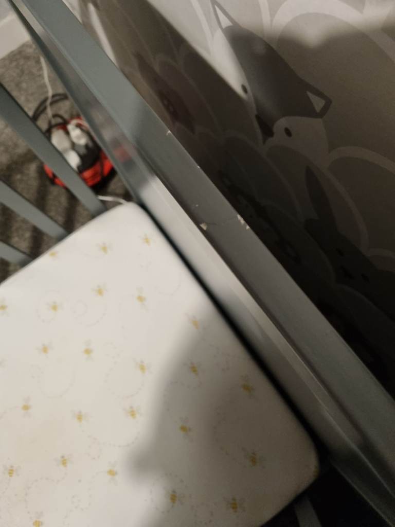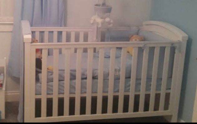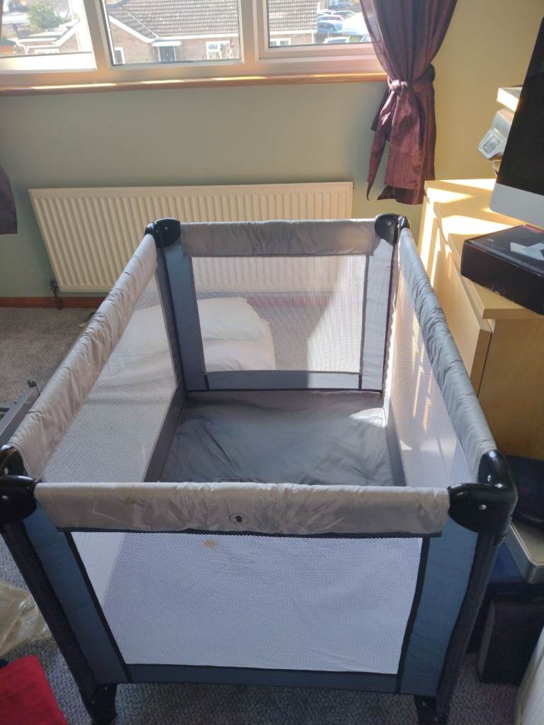 A lovely grey wooden cot. Teething rails to protect teeth. Mattress included. Suitable from bith until 3 years old. 3 height adjustable stages for growing baby. Brought from Symths. Full height details and description on last few pictures. Some marks on the wood as pictured. Mattress in excellent condition. No stains. Cot and mattress used for approx 2 years. I do have bedding for sale separately on my page. Cash in collection only.