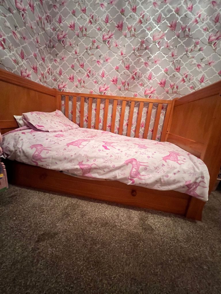 This beautiful wooden children’s sleigh bed comes with two sides. The photos only show one side up. It is in fantastic condition complete with a drawer underneath for storage.
