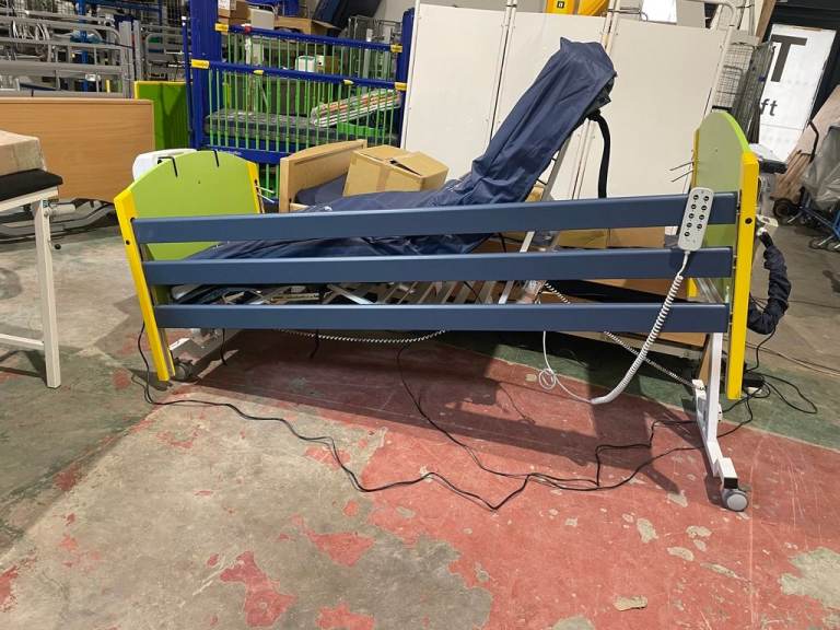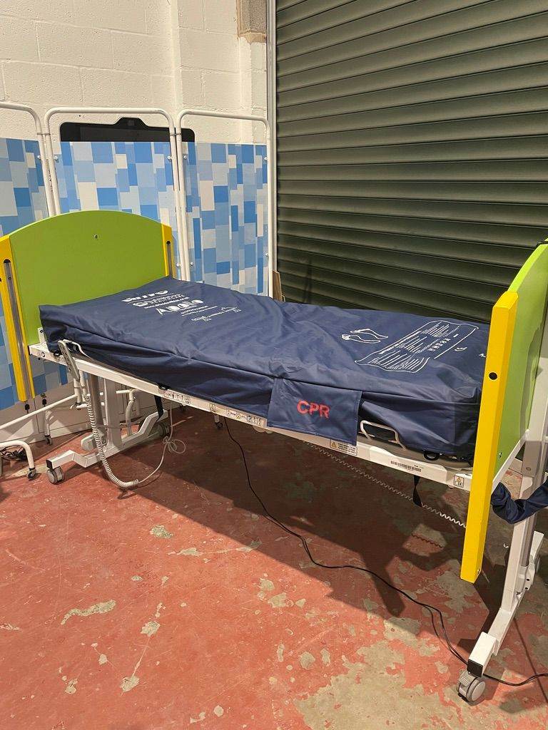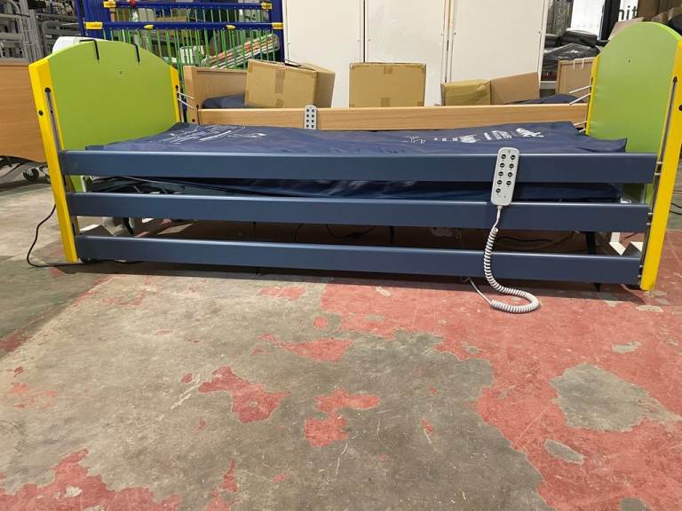 2023 Ex demonstration Sidhil Bradshaw Paediatric profiling bed specially designed for toddler to teen and anyone in between. Bright and colourful appearance helping the bed to fits into any children's environment. With a generous maximum user weight of 178kg (28 stone) the bed is designed to cater safely for parents sitting or lying on the bed and wishing to cradle children in their arms. The bed is easily collapsed/assembled for transportation.