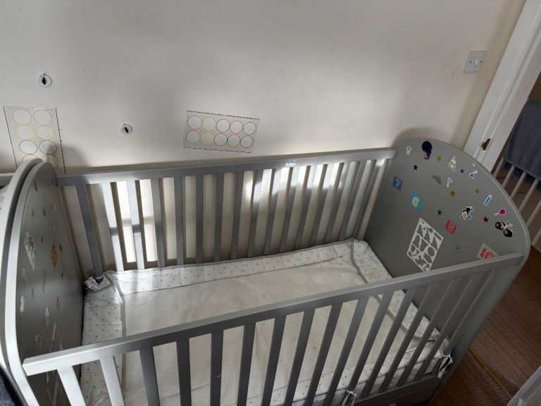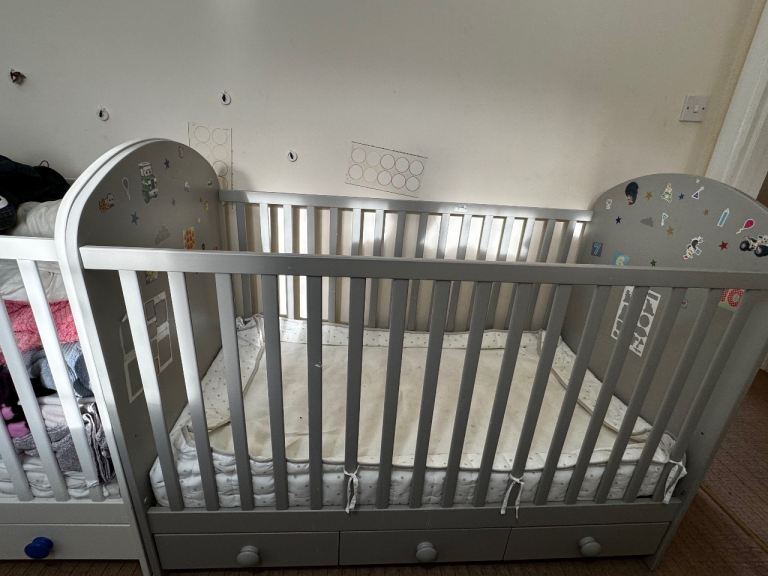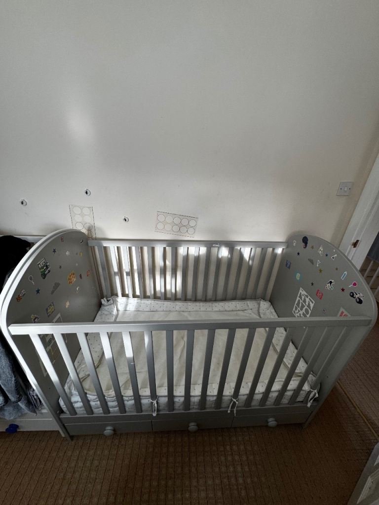 Solid grey wooden baby cot bed with slatted sides and decorated end panels. Comes with two built-in storage drawers underneath, perfect for keeping baby essentials handy. In good used condition, sturdy and practical.