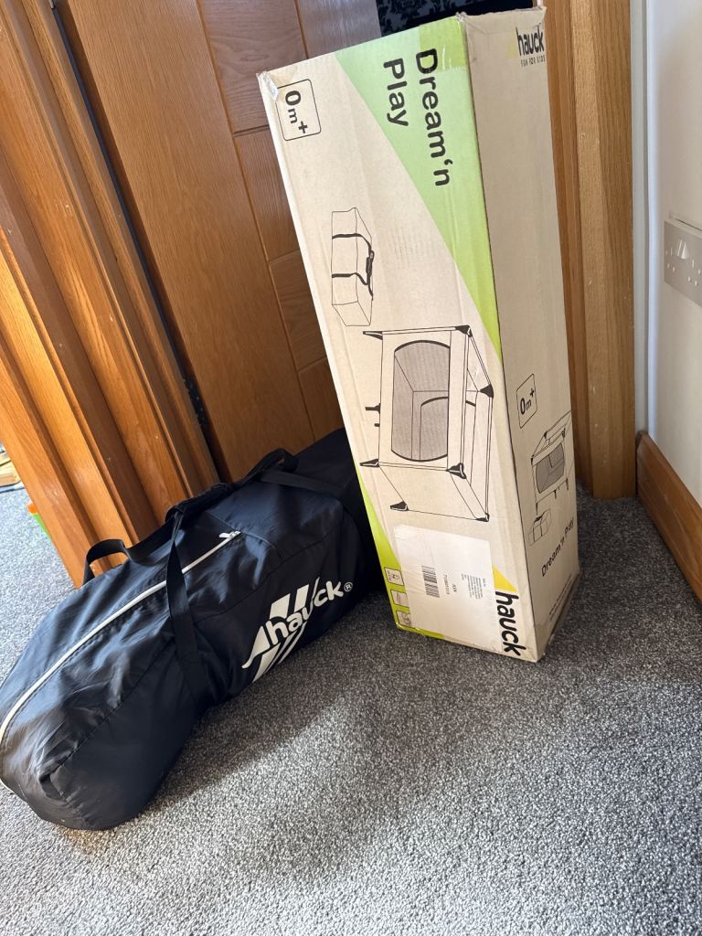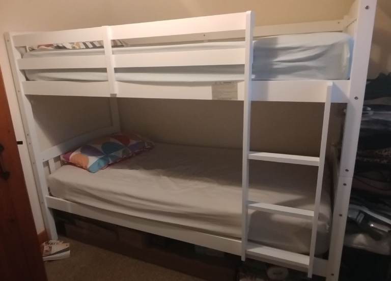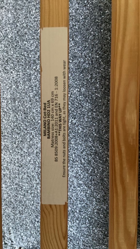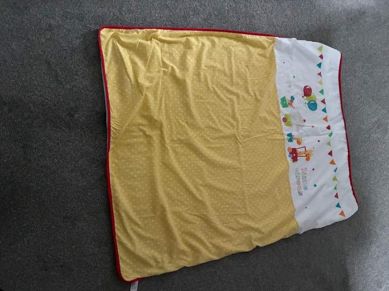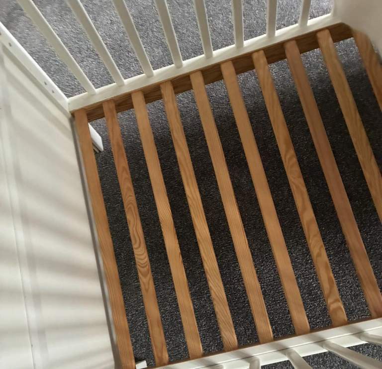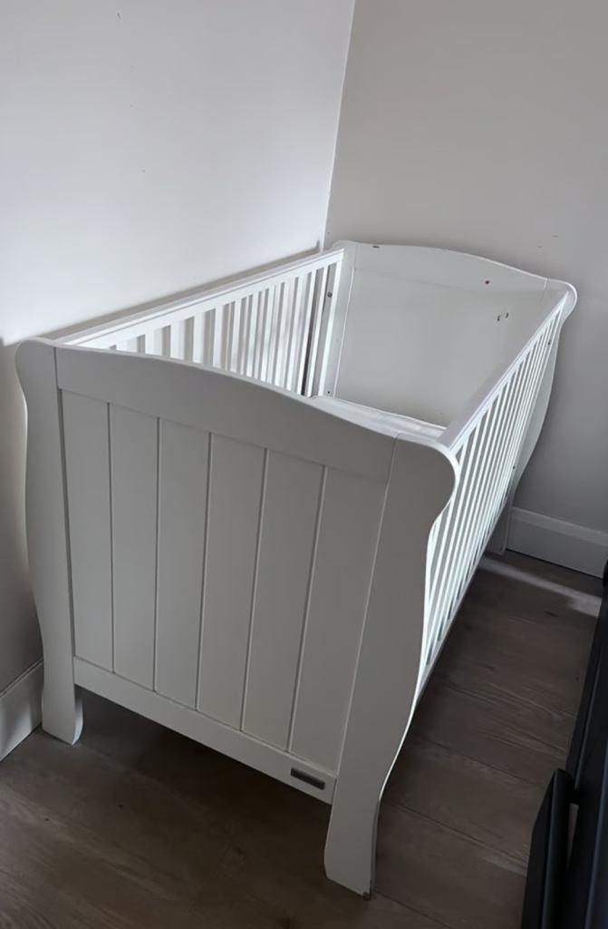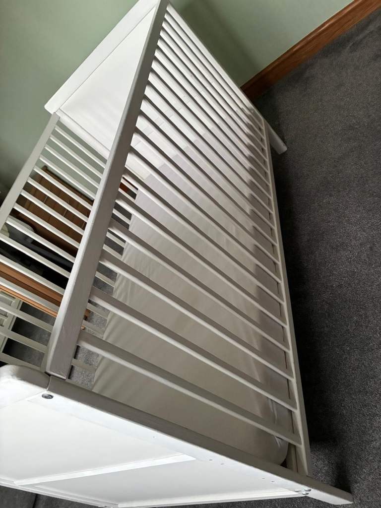 White wooden cot with mattress and printed bumper. In excellent condition.