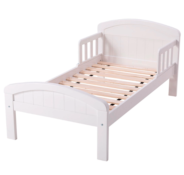Toddler bed with horizontal tongue & groove styling, mattress included.