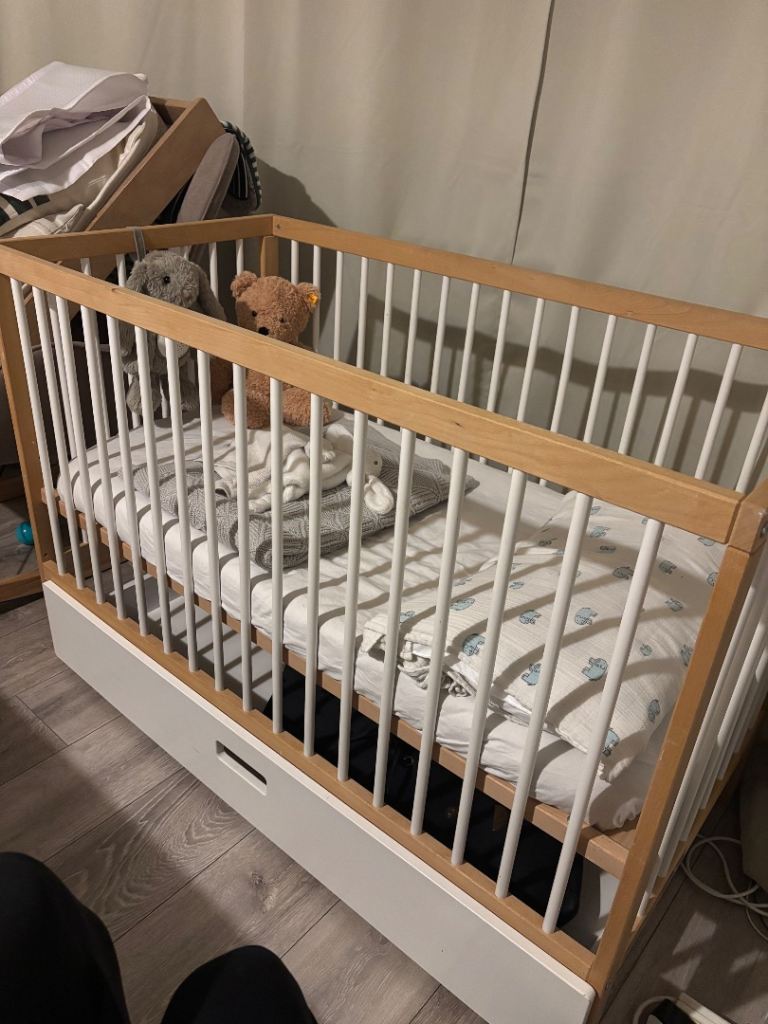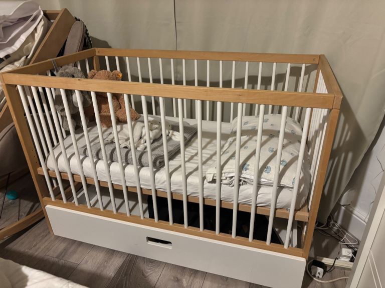 Mokee mini cot. White and wood. Modern looking. Compact for small spaces. 120x60 comes with mattress if wanted. 3 height position. Both Great condition. Odd scuff mark on cot, nothing visually noticeable unless looking close. Comes with free drawer. Pick up asap.