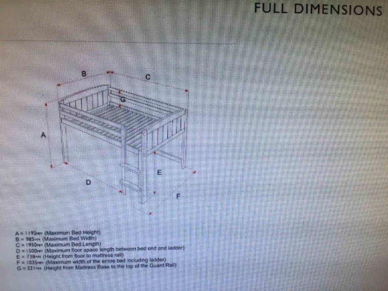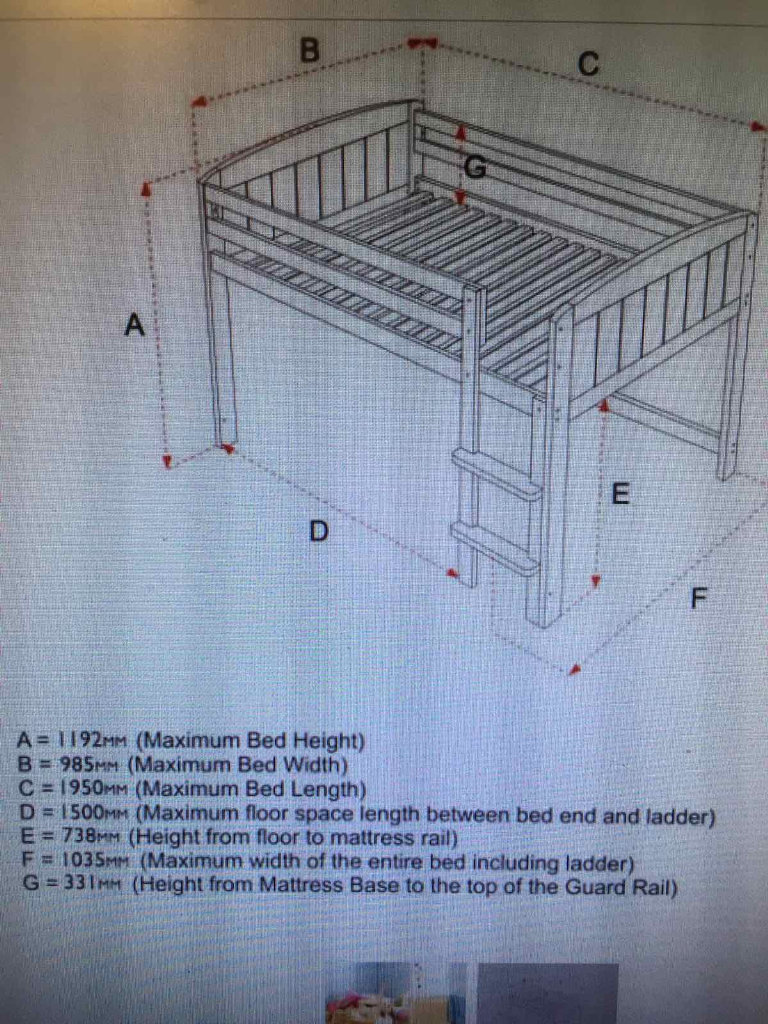 Bed dimensions: L 1950mm x W 985mm x H 1192mm. More dimensions on the pics attached.