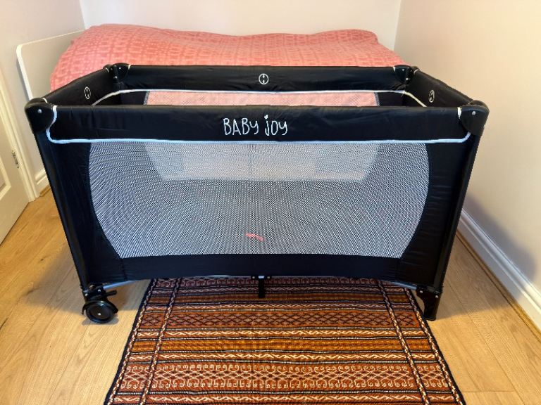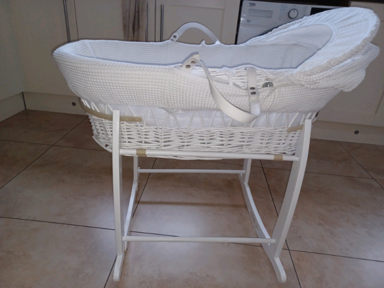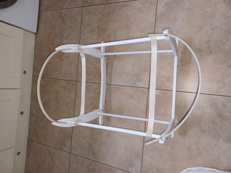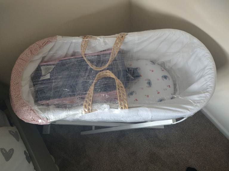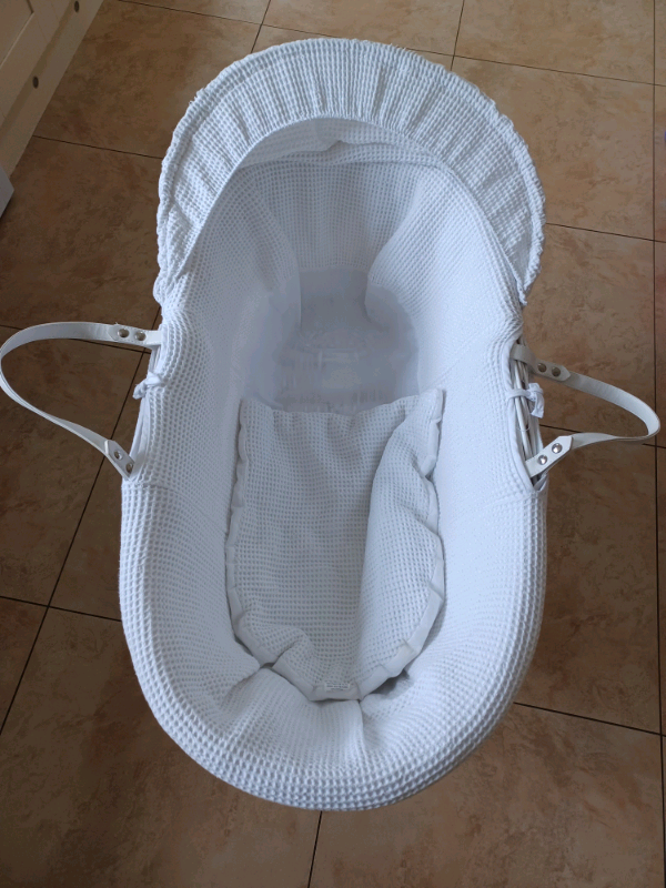 Comes with white waffle bedding and hood in picture. A few marks on the stand due to wear and tear but barely noticeable. Needs a new mattress. £30 for both