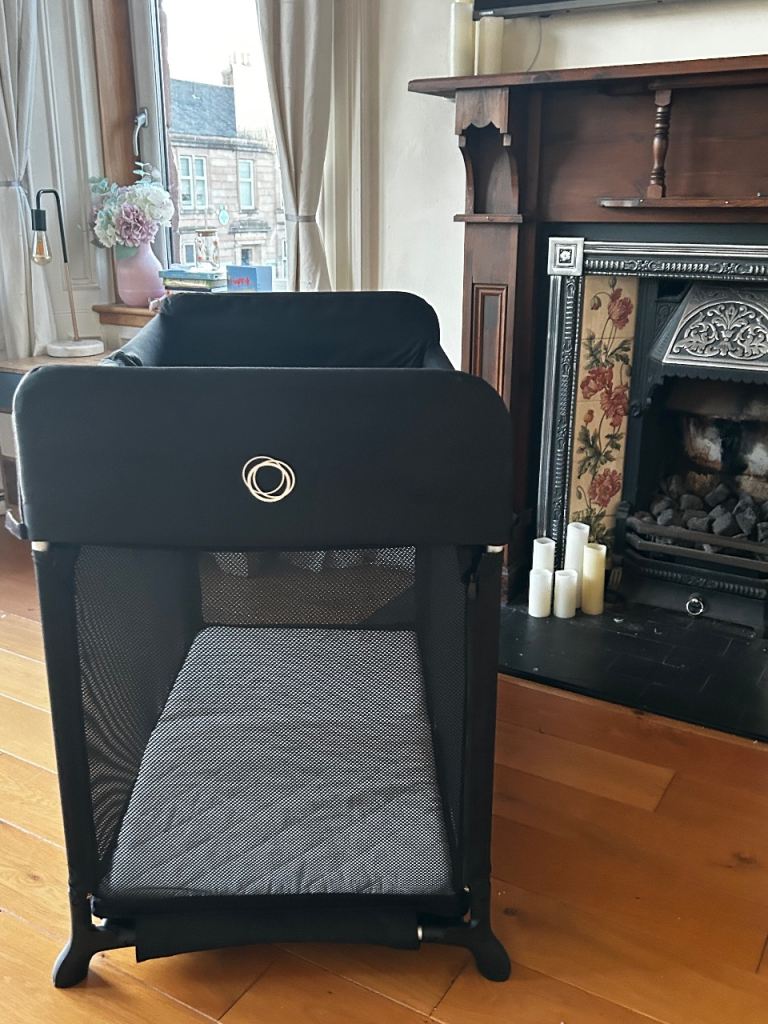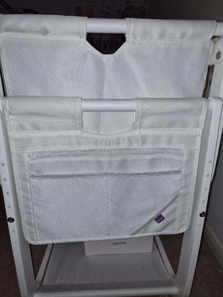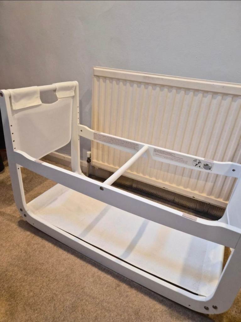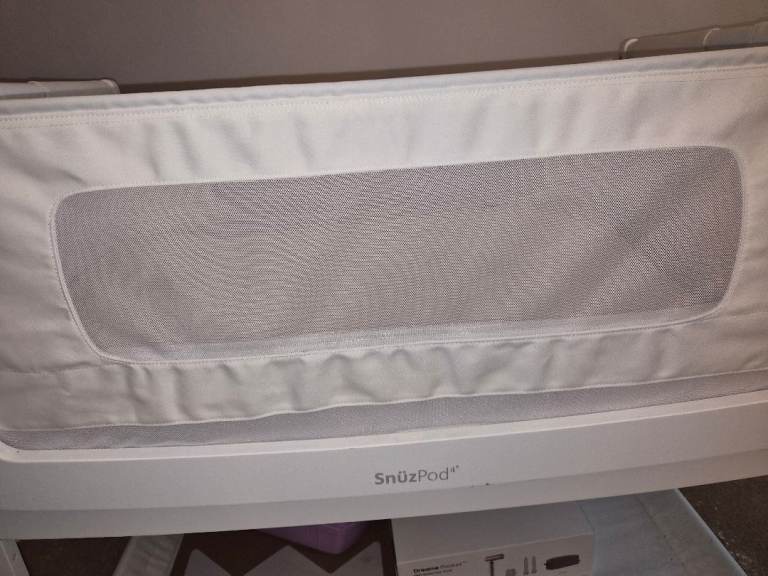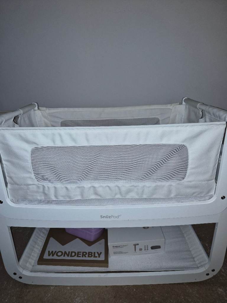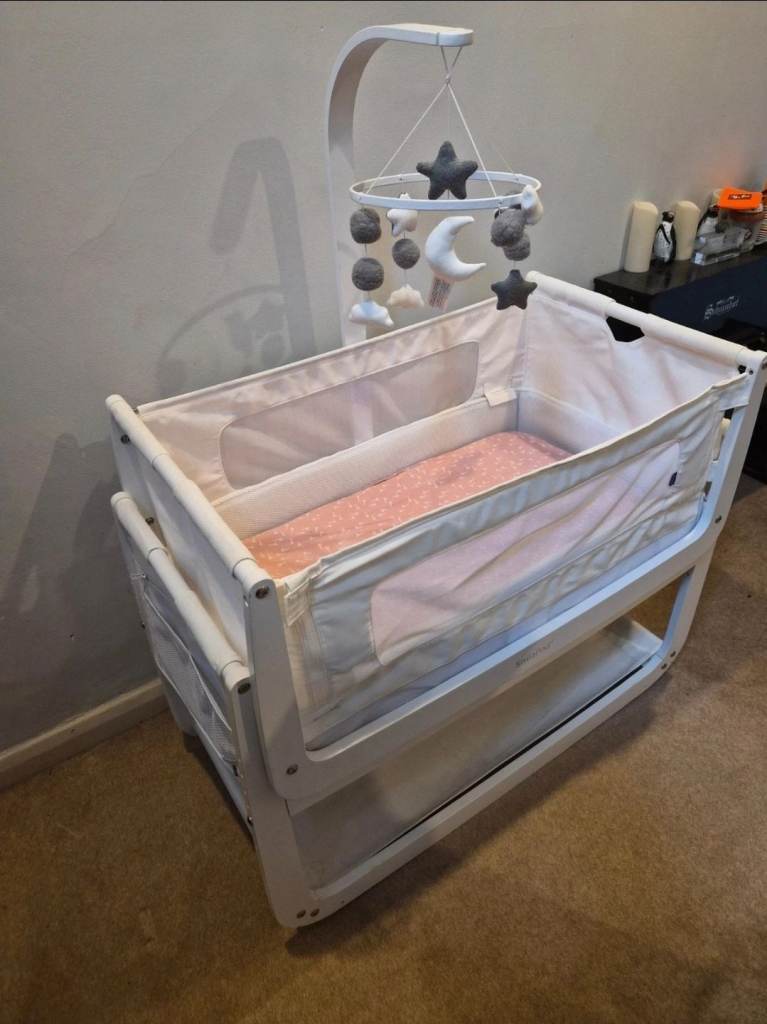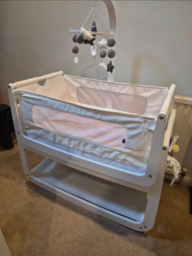 White snuzpod4. Comes with 2 mattress, mattress protector and mobile .