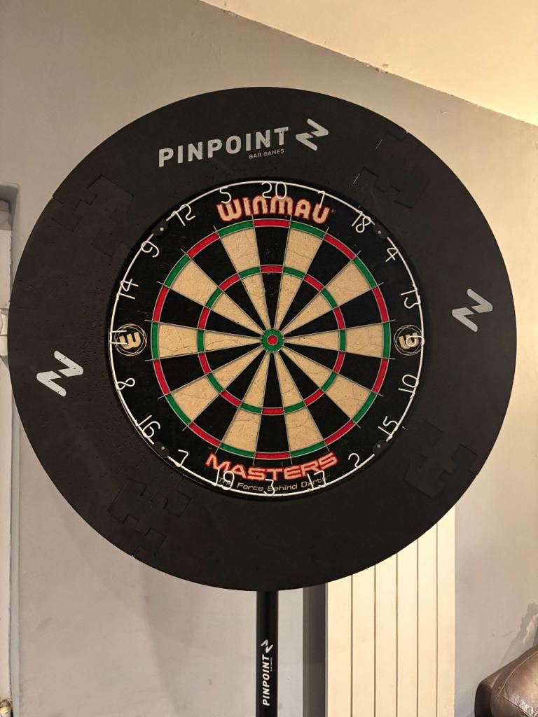 Hardly used dart board, stand and safety surround fully intact. £80 or best offer.