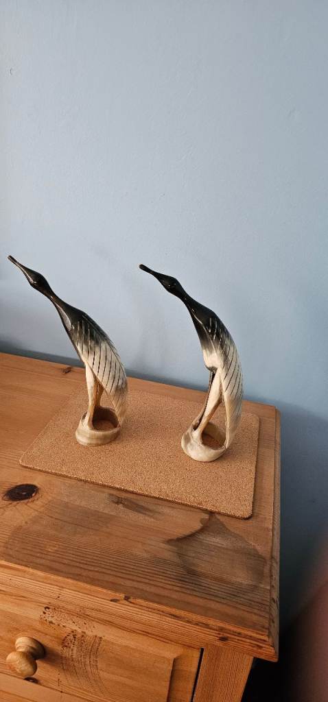 2 ANIMAL HORN ORNAMENTS. MATCHING PAIR OF AFRICAN HORN ORNAMENTS. 27CM HIGH. VERY GOOD CONDITION.
