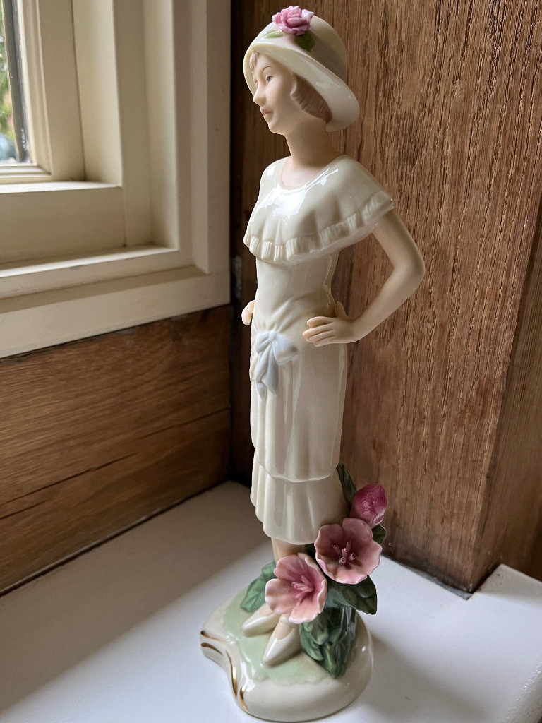 Introducing a beautiful porcelain lady figurine from The Regal Collection. This vintage piece is named "Clare" and stands at 27cm tall, making it a perfect addition to any collection. The figurine is made with high-quality porcelain and features great detailing, making it a very decorative item.This original figurine is from the 21st century and has a printed backstamp. The Regal Collection is a well-known product line, and this item is perfect for collectors or anyone who appreciates vintage fashion. The pastel coloured figurine is made with a glossy finish, and is a great representation of a lady's style. This item is perfect for display and will add a touch of elegance to any room.