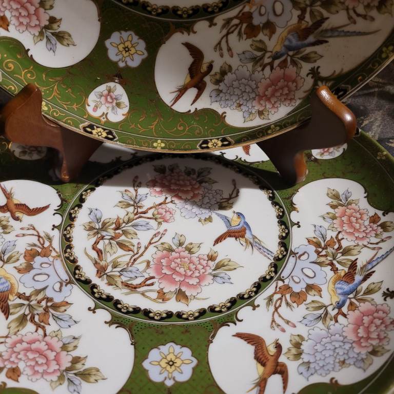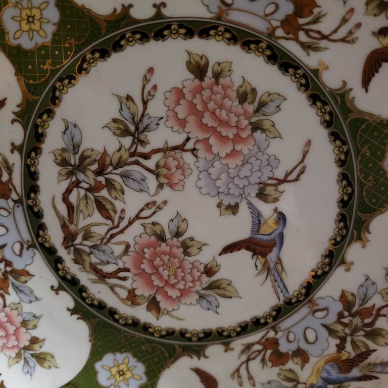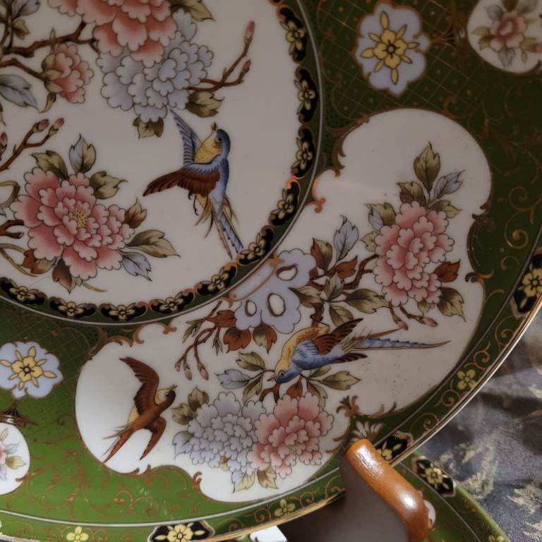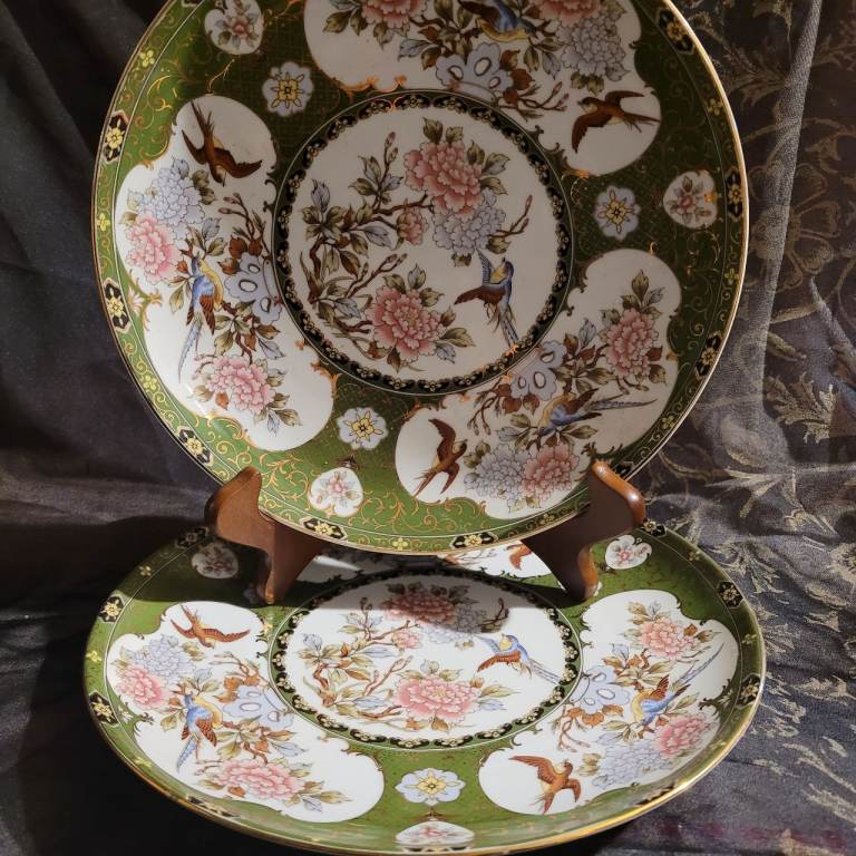 2 x Vintage EIWA KINSEI Japan Imari Green Gold Peony Flowers Birds Plates 26cm ML
