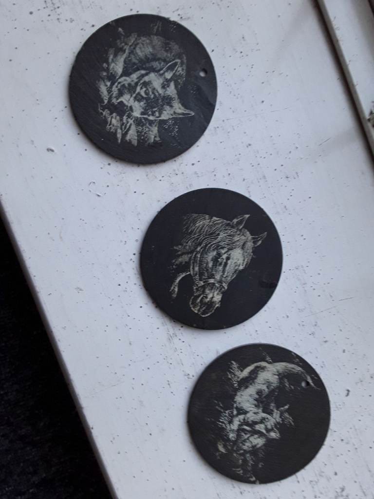 Slate horses head coaster, fox cub or otter with fish wallhang or coasters, 8.5 cm W. £2 ea. COLLECTION ONLY city ctr NR1 1LA