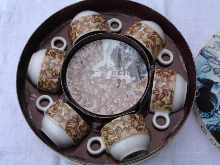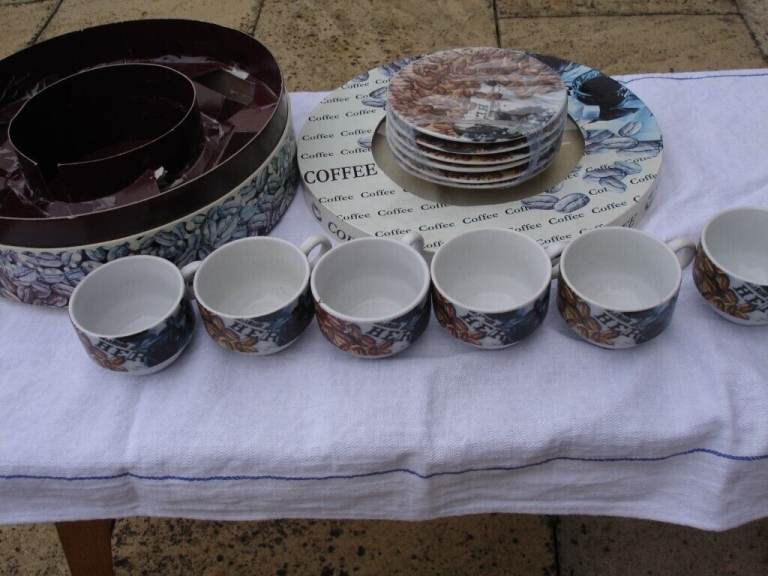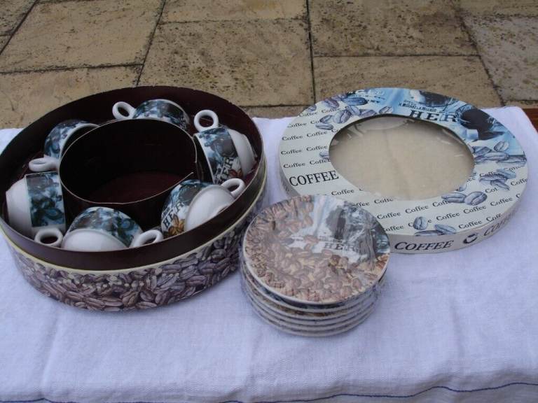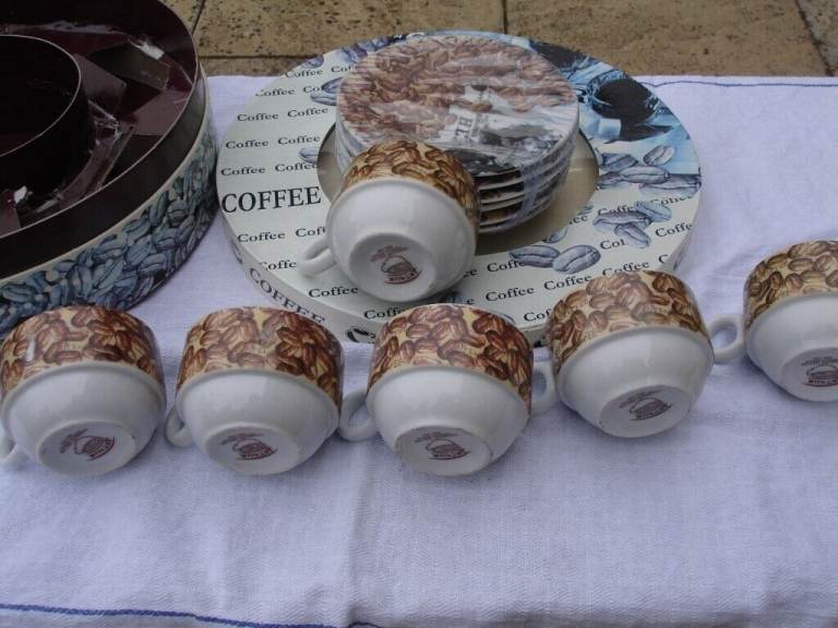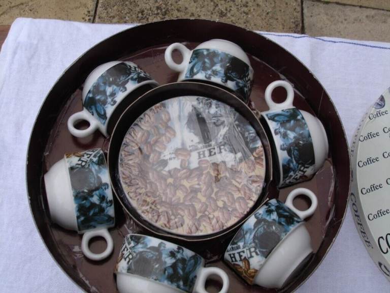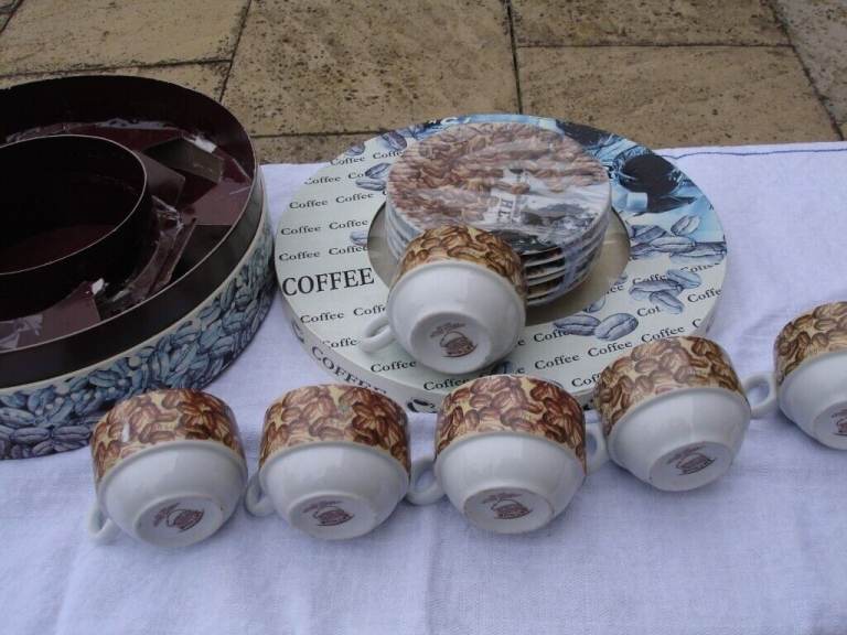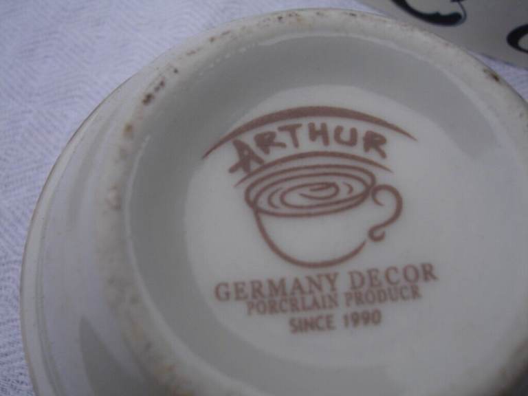 COFFEE SET( ARTHUR GERMAN DECO PORCRLIAN PRODUCT SINCE 1990) ornaments 6 coffee mini saucers 6 coffee mini cups with coffee beans pic and writing on one side of cup and blue pic on other side of cup a nice show pieces OR use as a gift in round original box in v. good condition.£4