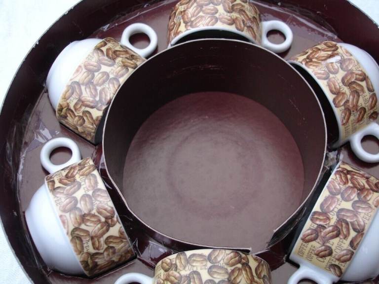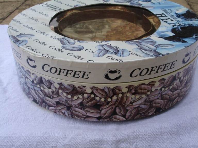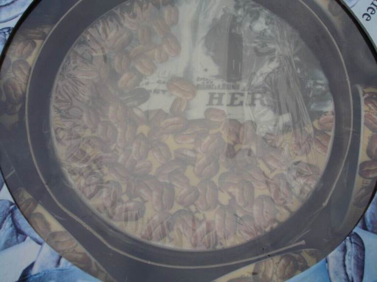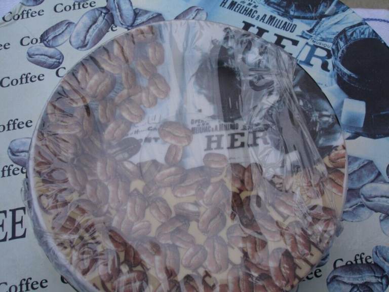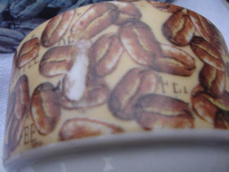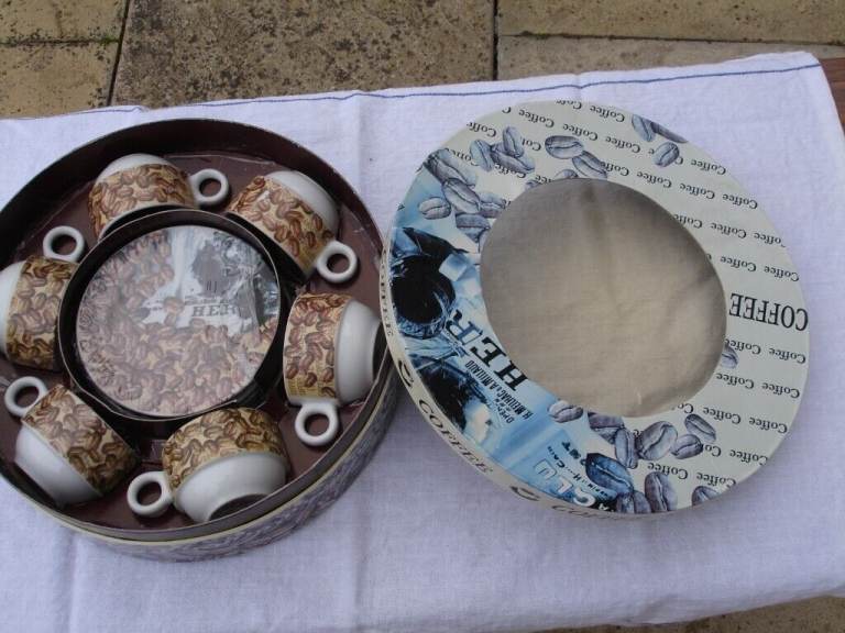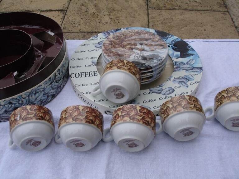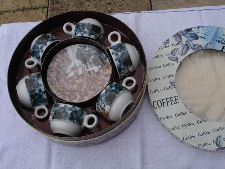 COFFEE SET( ARTHUR GERMAN DECO PORCRLIAN PRODUCT SINCE 1990) ornaments 6 coffee mini saucers 6 coffee mini cups with coffee beans pic and writing on one side of cup and blue pic on other side of cup a nice show pieces OR use as a gift in round original box in v. good condition.£4