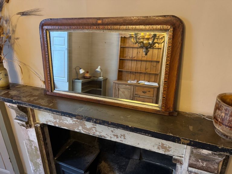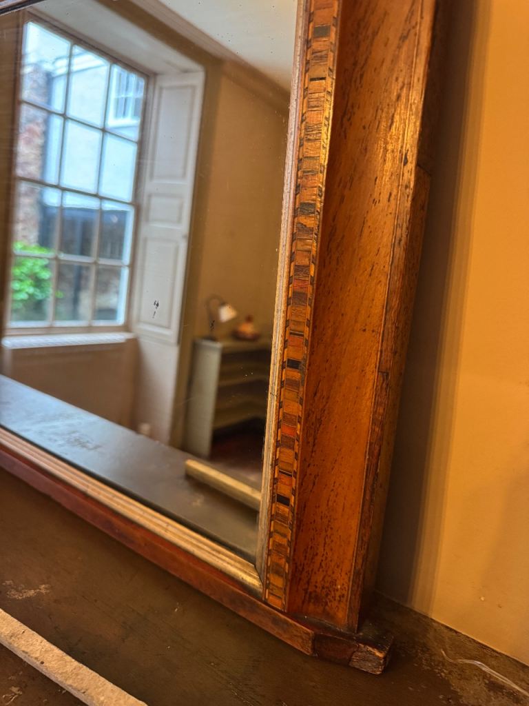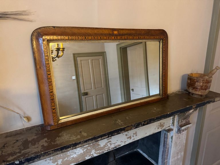 Posting for under a monthAntique walnut overmantel mirror with marquetry inlay and giltwood inner frame. VG condition.