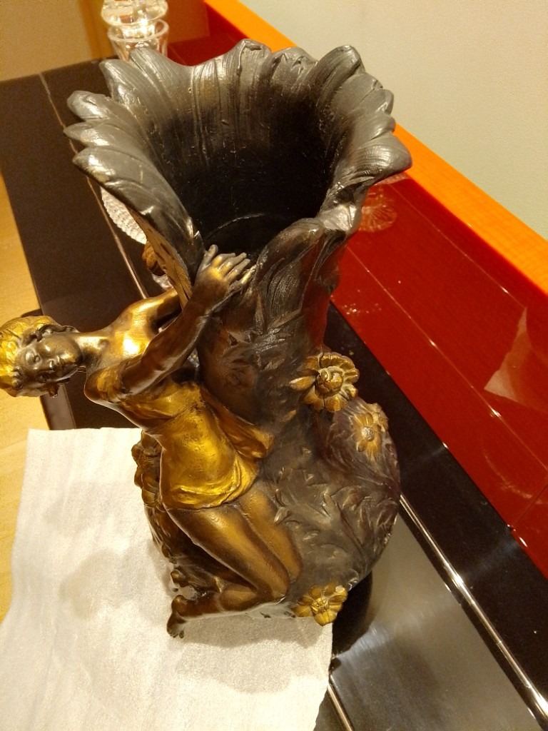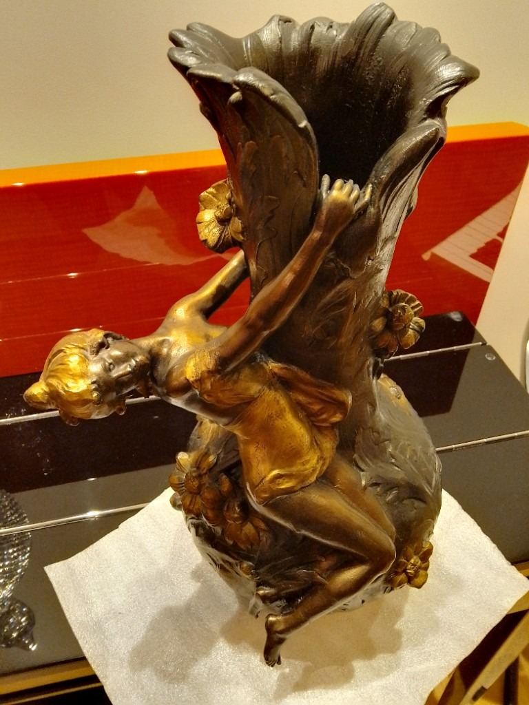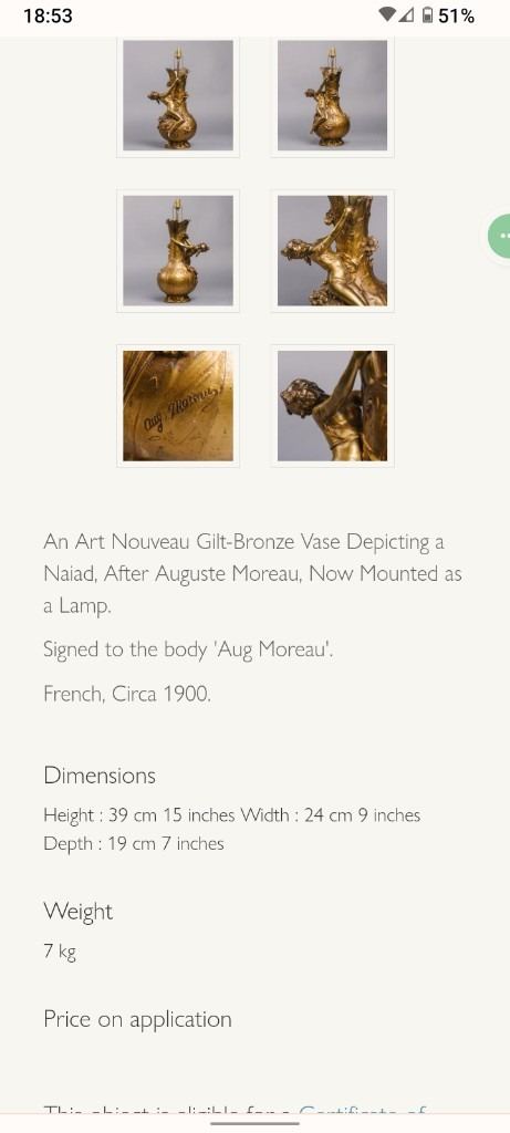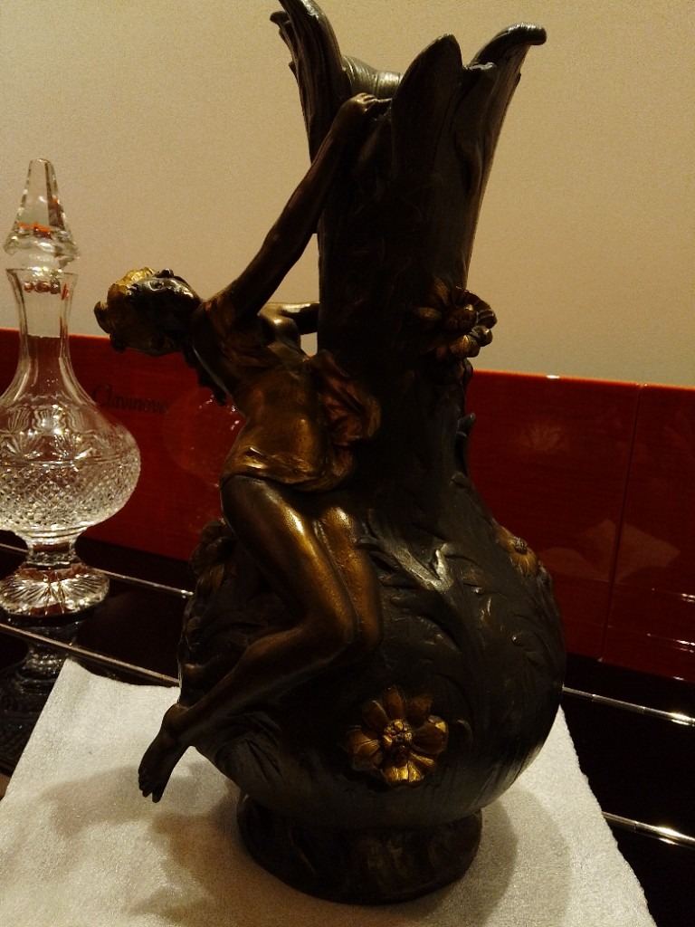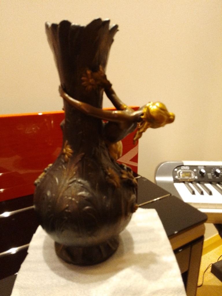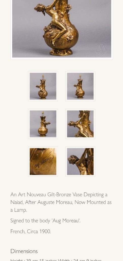 This Augustus Moreau vase was purchased in Paris some 40 years ago, it is a beautiful piece in every way, the latter pictures are from a dealer who is selling the same item that has been guilted and has had a light fitting attached but it does give a dealer description.