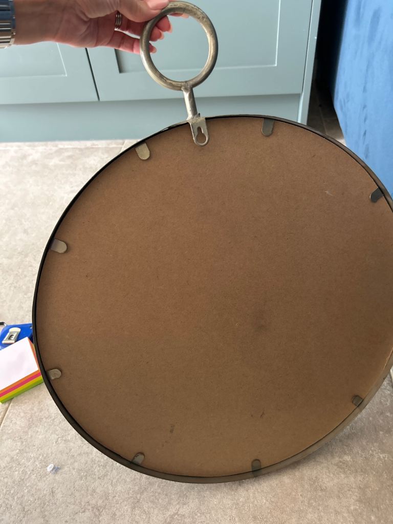 This mirror is in excellent condition. Really unusual design with loop. The mirror is 35cm wide including the the frame and 56cm from the top of the loop to the bottom of the frame.
