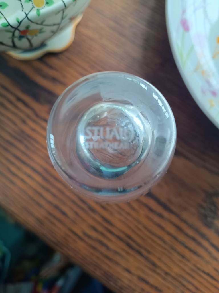 Lovely little Scottish crystal vase by STUART STRATHEARN with pretty fushia flower etching. Stands 12.5cm tall, is heavy bottomed and in immaculate condition. It is etched on the base with the designers name.