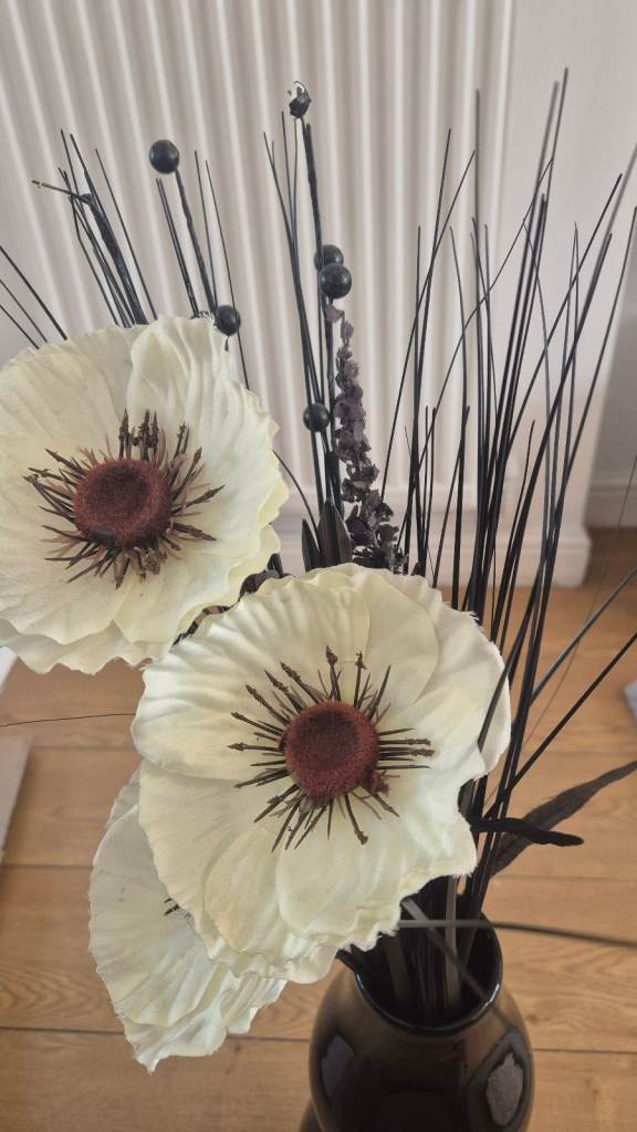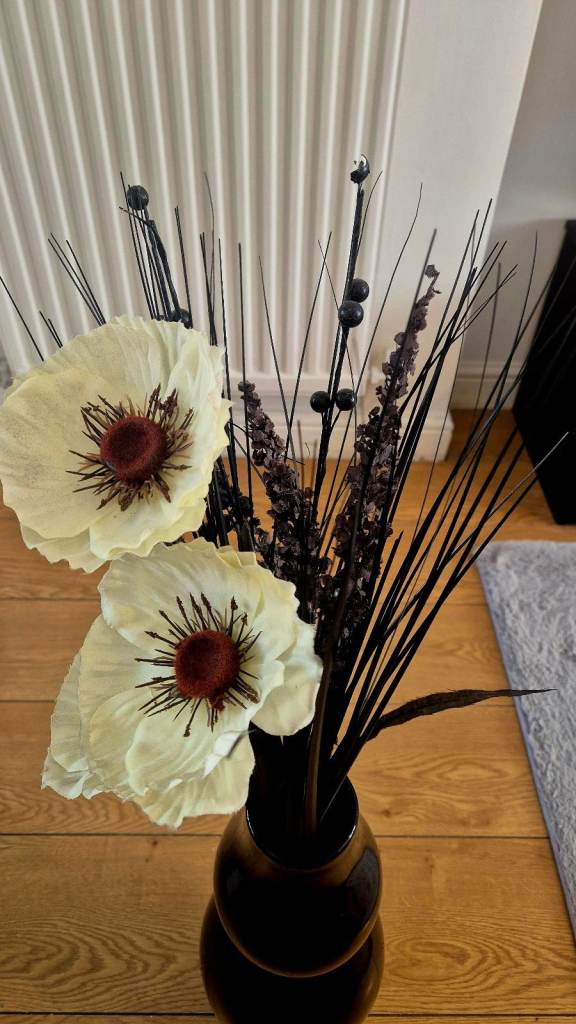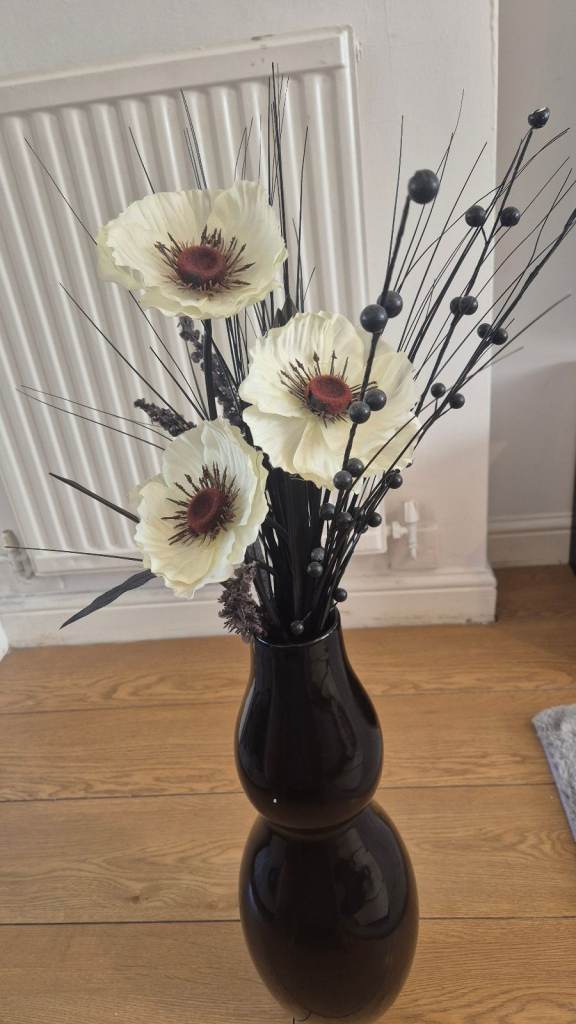 Posting for 4+ monthsBlack ceramic vase with faux flower arrangement