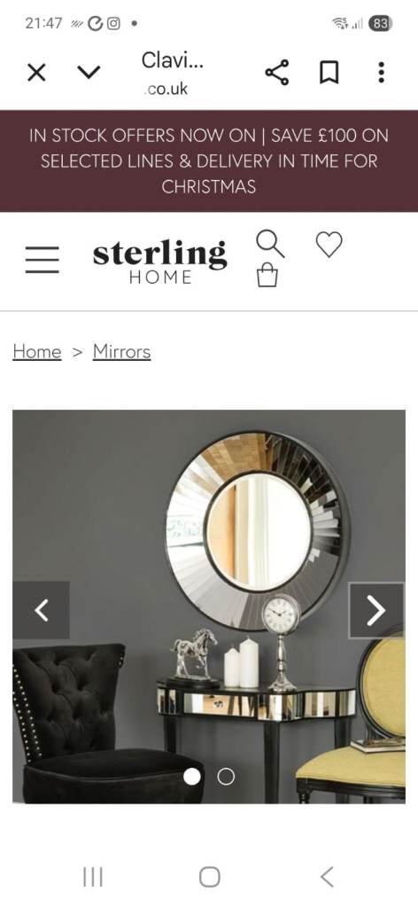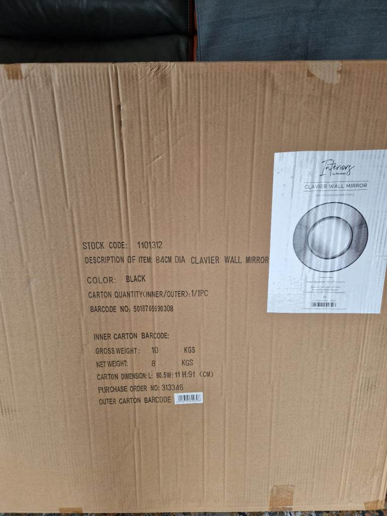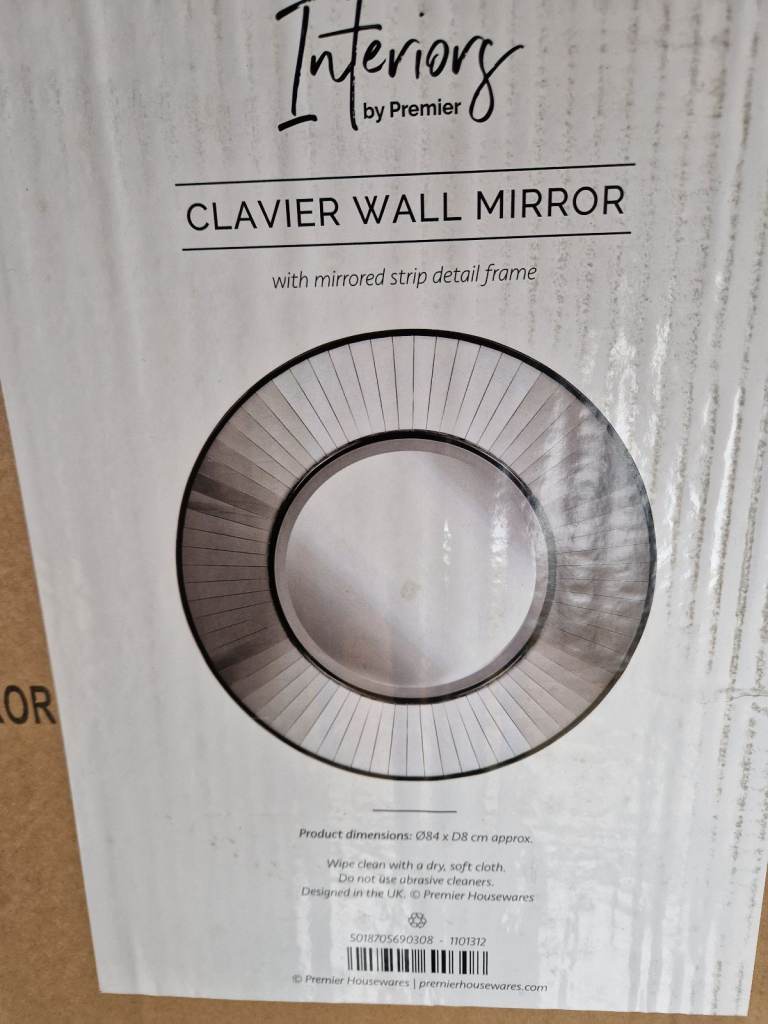 Brand new Clavier Wall Mirror with mirrored strip detail frame. Date recieved 14 October 2025. Does not suit our decor and returned date expired after trying it out. 84cm wide by 8cm deep.
