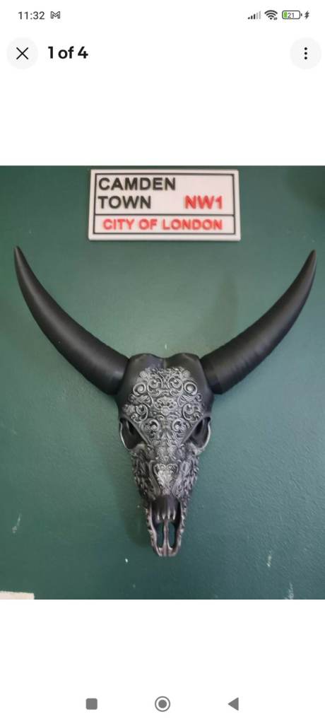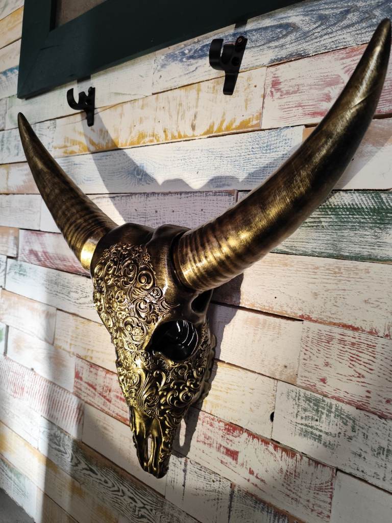 Hand painted and gilded buffalo skulls. Large is 55cm tall for £50 and XL is 65cm tall for ££70 p&p £3.50. Message for more info.