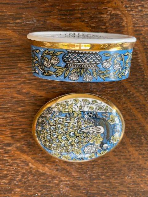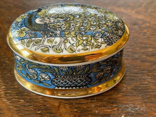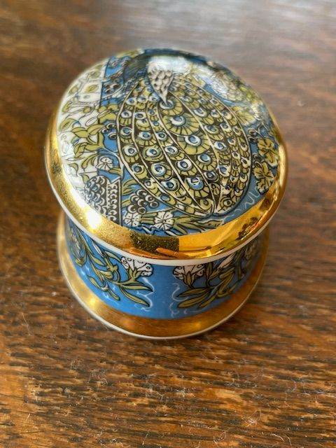 For sale is a china lidded pot with a peacock decoration