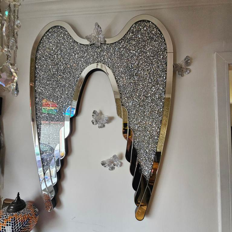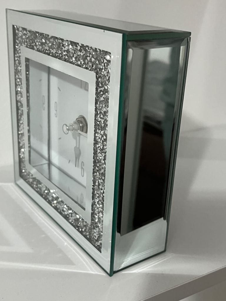 Clock with mirrored sides and sparkle front, the clock is battery operated which takes a single AA battery and is in very good condition.