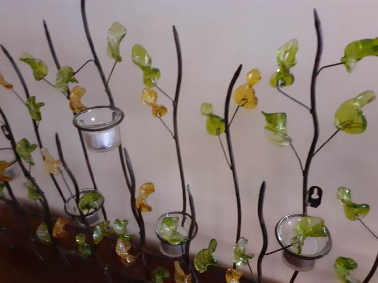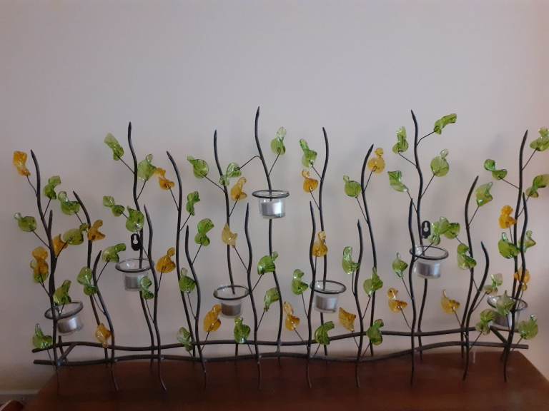 Beautiful glass and metal tea light holder. 100cm wide x 12cm deep x 51cm high. Takes 7 tea lights. Works well as a summer fireplace display. Can be wall mounted. Love this item, but house move necessitates sale. :(