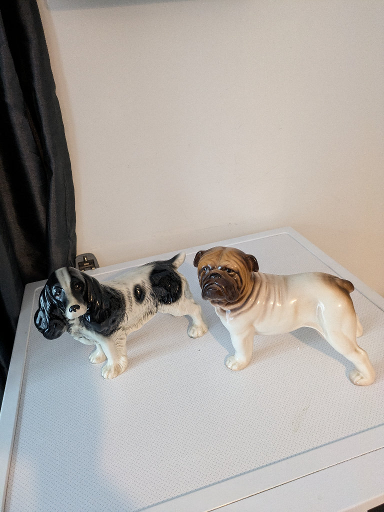 Dog Ornaments, one Bull Dog and one Black and White Spaniel. Collectables. Excellent Condition.