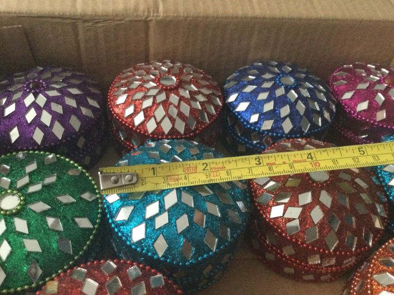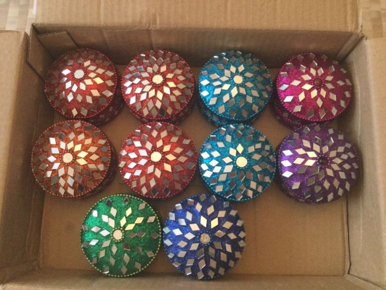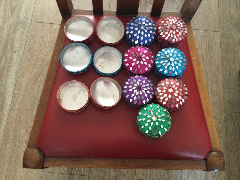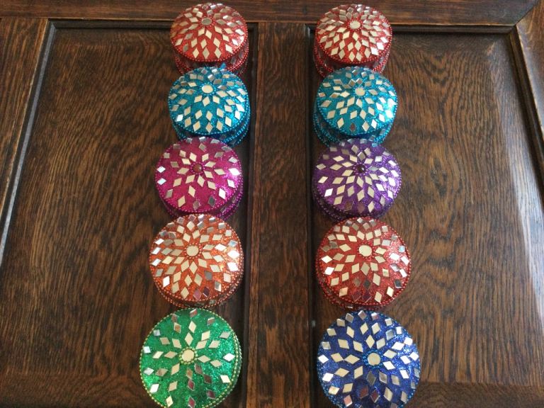 Hand made glass sparkly round jewellery metal box or can use as gift box lovely colours and very pretty on the dressing table comes from pet and smoke free home collection please £2.50 each or £20 for all thank you x