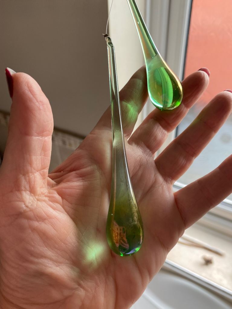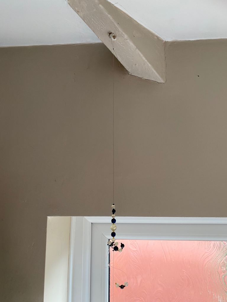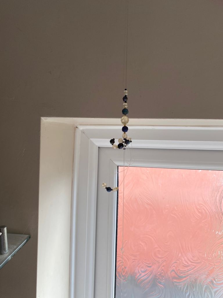 A bit of unravelling the line at the beads required. Catches the light snd reflects the colours into the room . Hand made