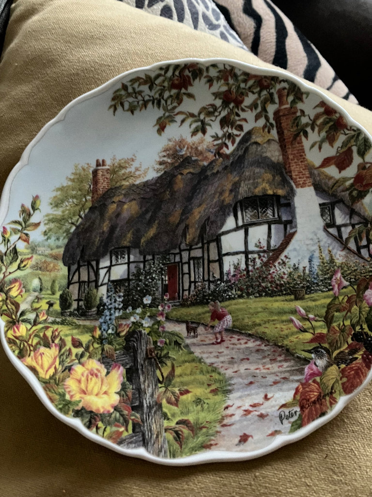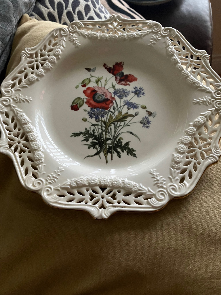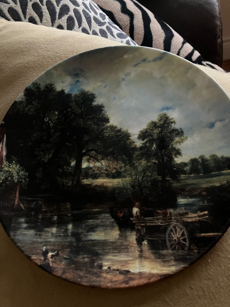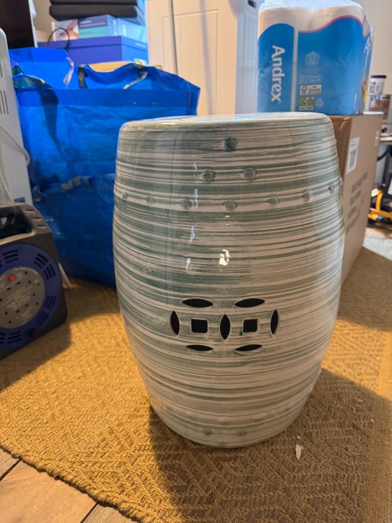 Gorgeous decorative barrel (teal and white), great to use as an end table or a pedestal in the hall. Quite heavy and excellent quality.