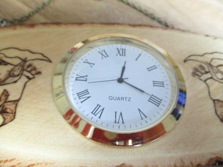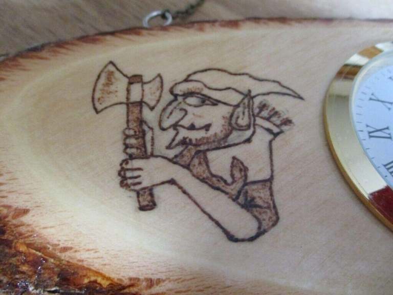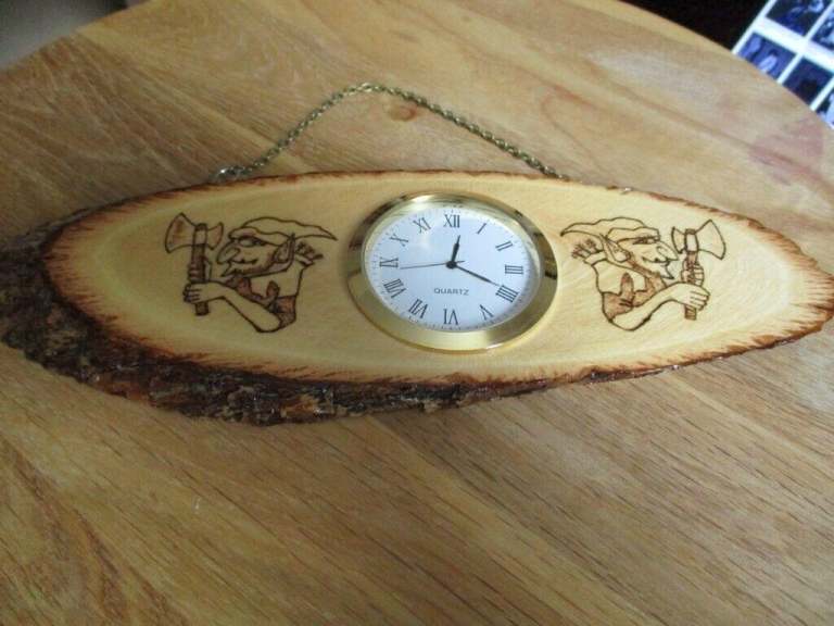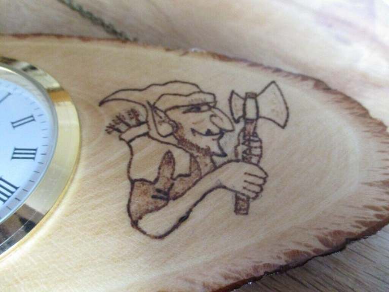 Hand burnt pyrography Hobgoblin images completed by hand to each side of the clock face.
