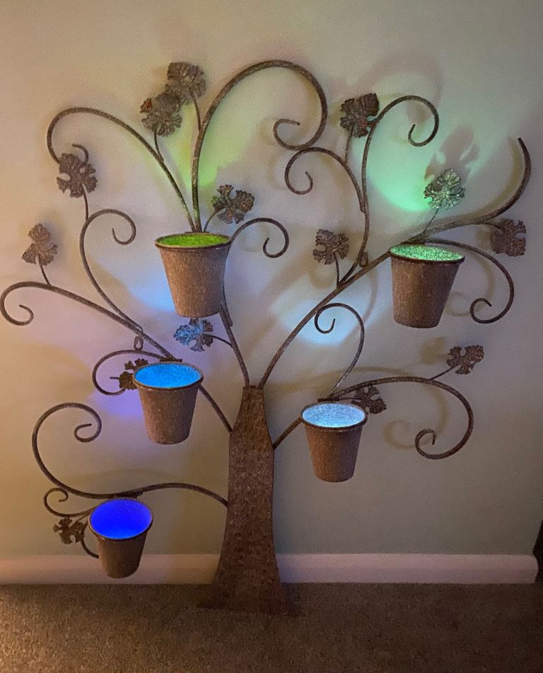 INDOOR / OUTDOOR LARGE WALL-HANGING OR FLOOR STANDING METAL RUSTIC TREE WITH 5 REMOVABLE POTS THAT COULD BE USED FOR PLANTS / CANDLES ETC. COULD ALSO LOOK GREAT DECORATED WITH FAIRY LIGHTS AND SNOW SPRAY FOR CHRISTMAS. FOR WALL /FENCE ETC. COLOUR-CHANGING CANDLES NOT INCLUDED. 38 INCHES WIDE X