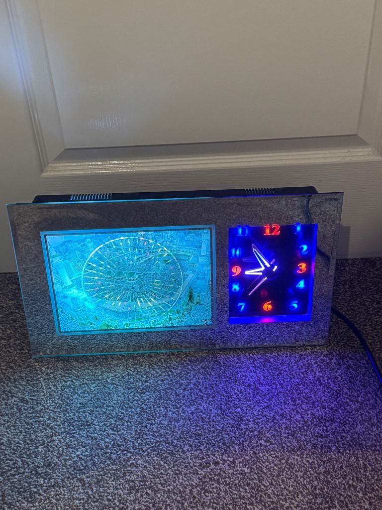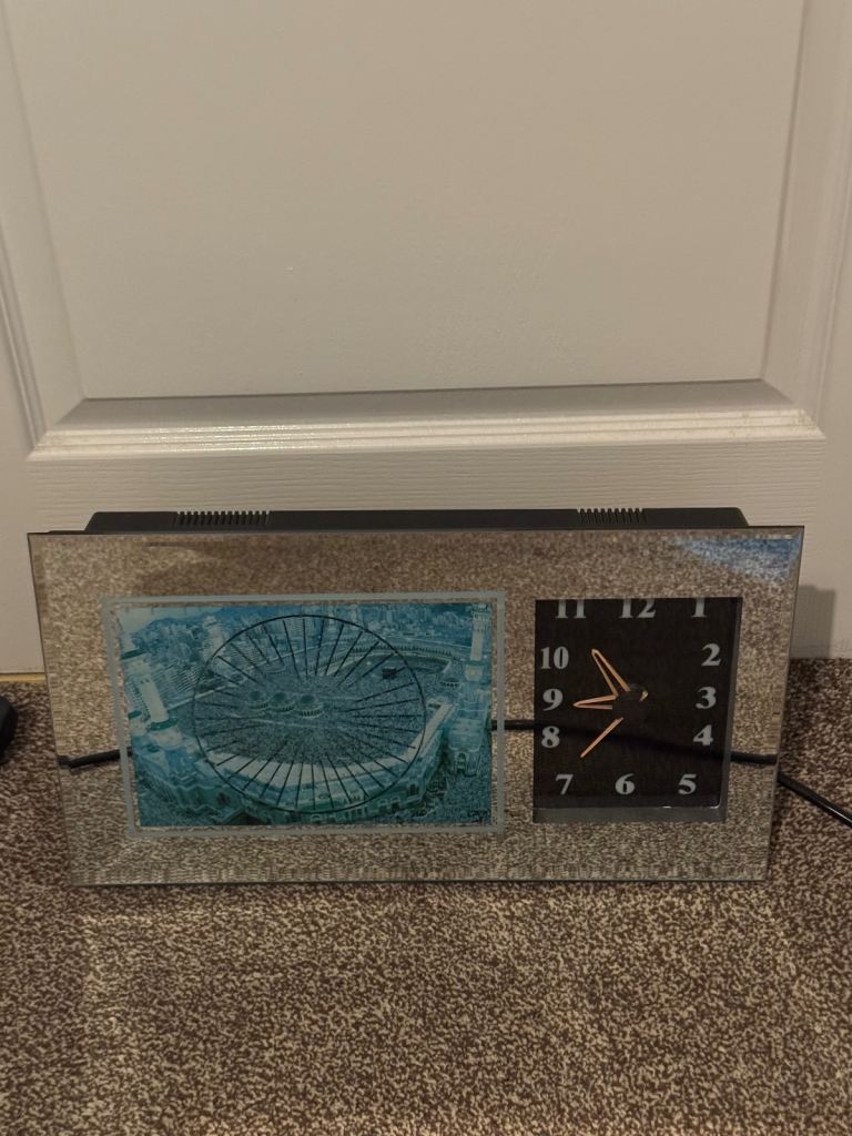 This is a beautiful Islamic wall clock featuring a mirrored glass frame and a detailed image of the Kaaba in Makkah. The clock has a modern, reflective border with a black face, white numbers, and orange hands. It runs on a quiet quartz mechanism and is battery-operated (AA battery not included).
