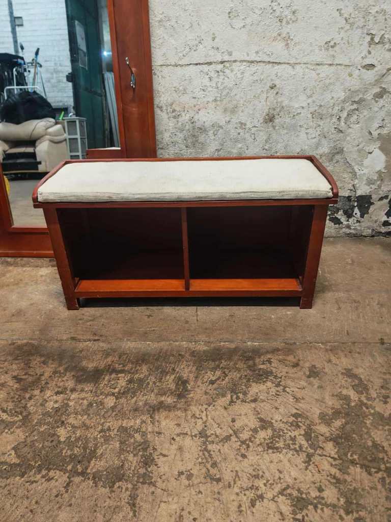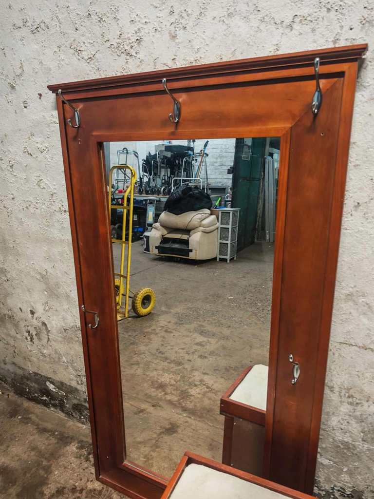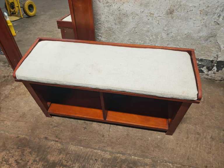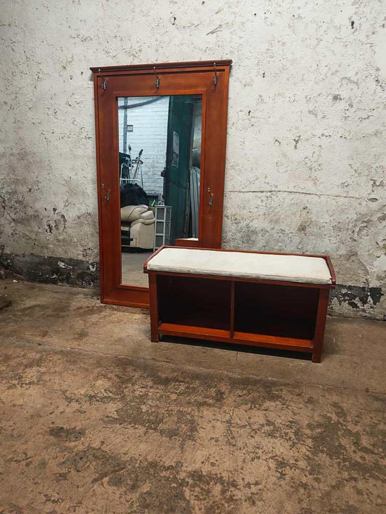 This is a lovely large hall wall mirror. The mirror has a number of hooks for hanging coats etc on. There is a small matching bench that can sit bellow the mirror. It has open shelving for shoes etc. Cushion would benefit from a upholstery clean. This is a cracking set of you have the right size hallway. Sizes are: