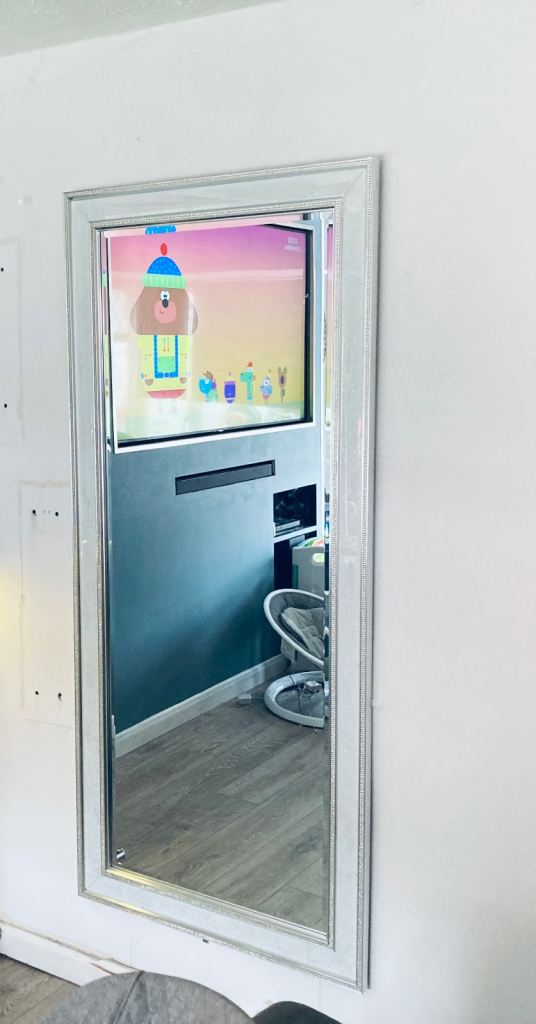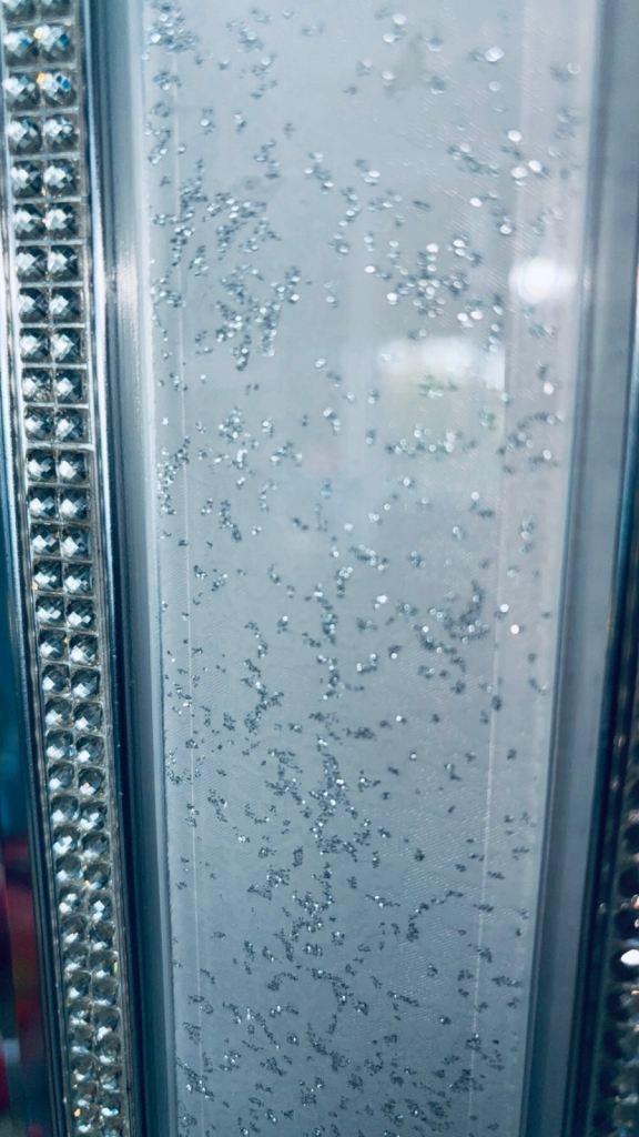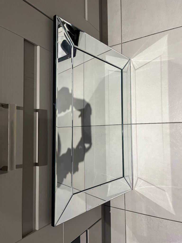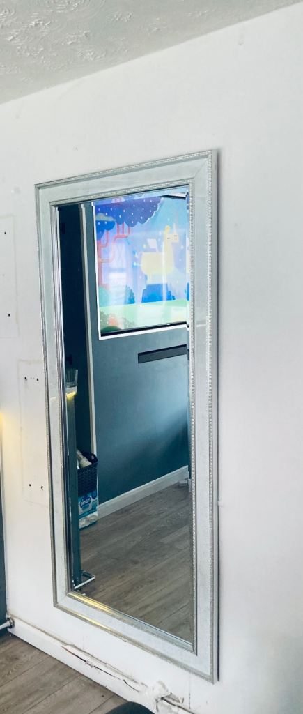 Large Mirror, Excellent condition, White and Chrome with Diamante detailing, Bevelled detail to mirror, Mirror can be hung, or leaned up against wall, Overall measures 31 half inch width x 69 inch high, Can also deliver for small fee, thanks.