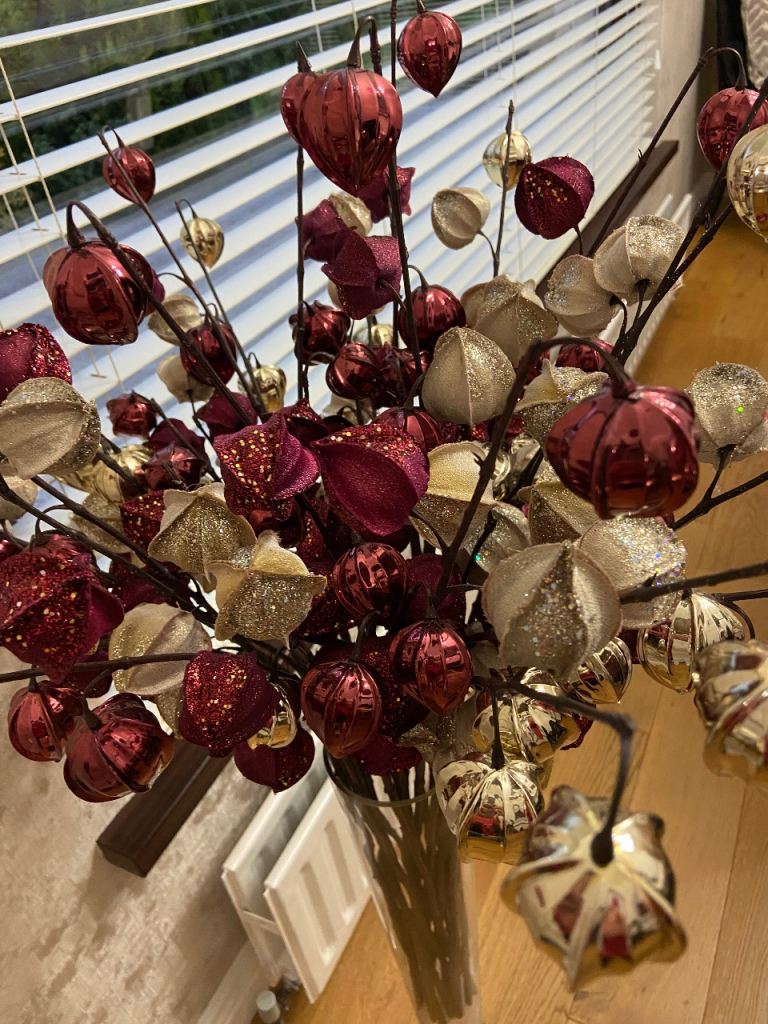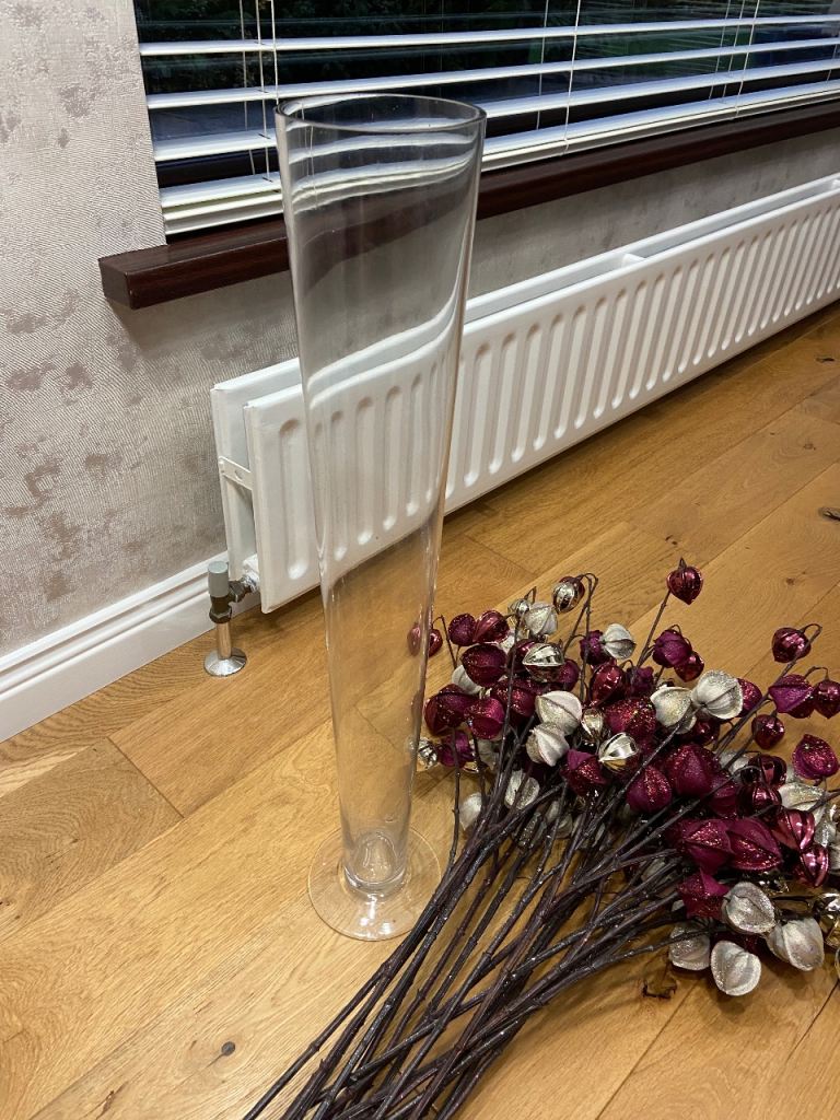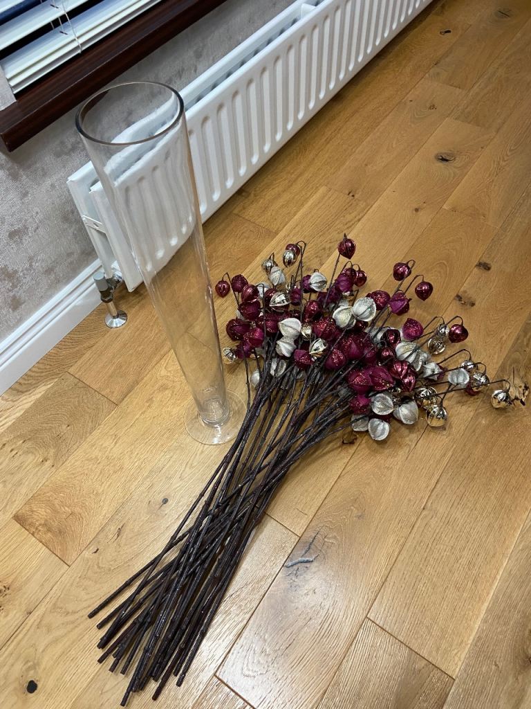 Large / Tall Glass Vase & 22 Burgundy & Gold Stems - See All Photos