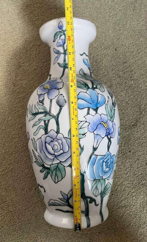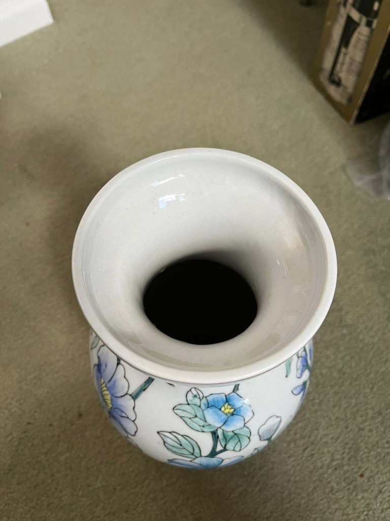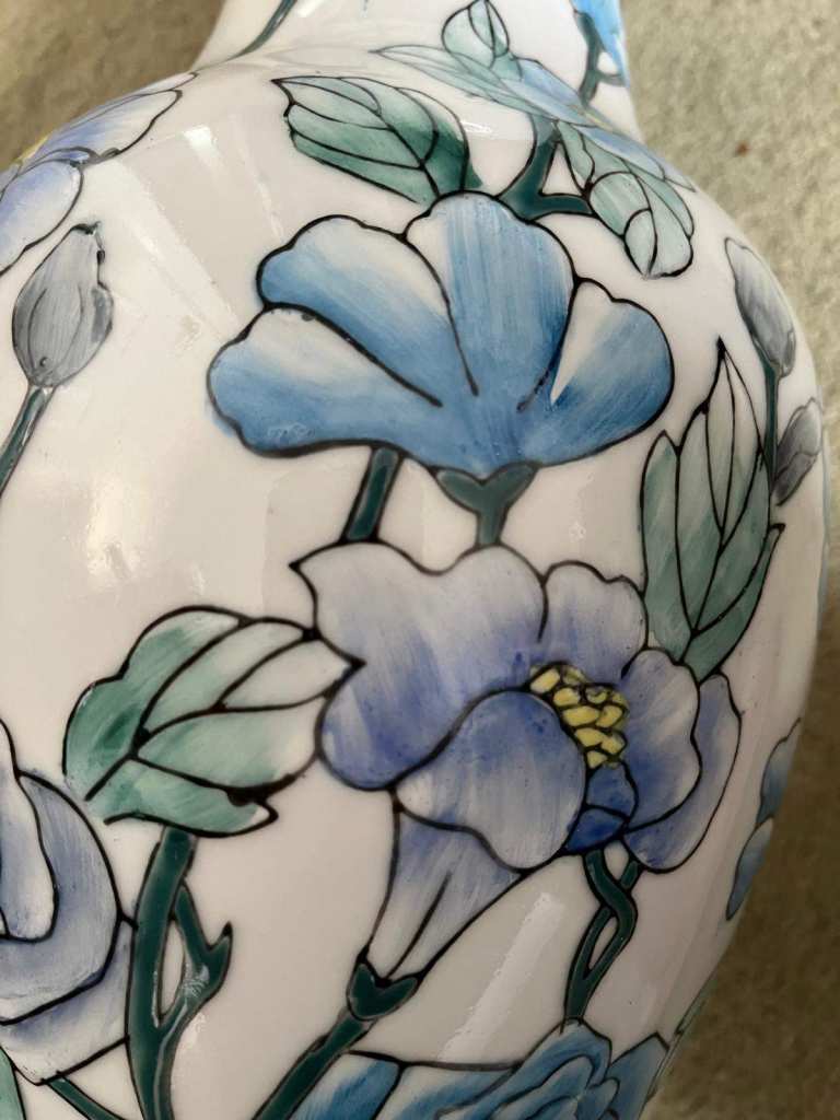 This vintage Chinese ceramic vase features a stunning high-relief floral design with a lovely textured finish in blue, lavender, green and yellow tones on a white background. The raised texture gives it beautiful dimension and visual interest, making it a perfect statement piece for a shelf, entryway, or side-table. It is in excellent condition: no chips or cracks - just some very slight staining on the base. Collection only from Kenilworth.