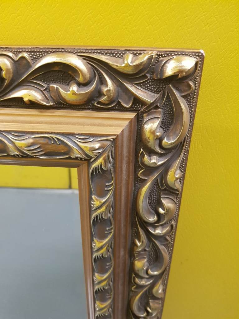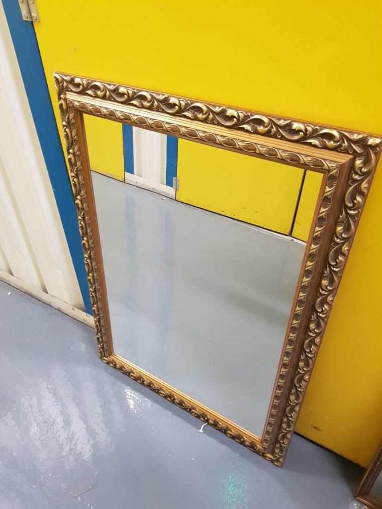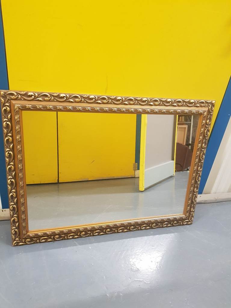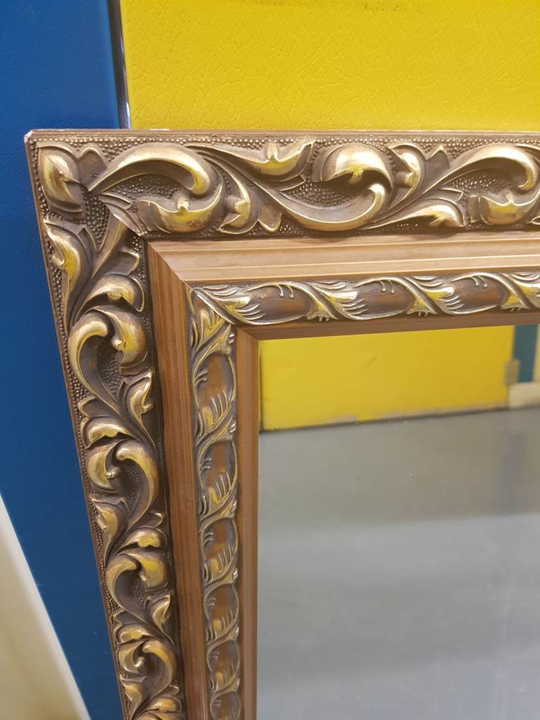A large ornate vintage rectangular mirror. Wood/Gilt gold frame. 37in(94cm x 27.5in(70cm) Used. Good condition. No chips or cracks in the glass. Some minor signs of wear on the frame.
