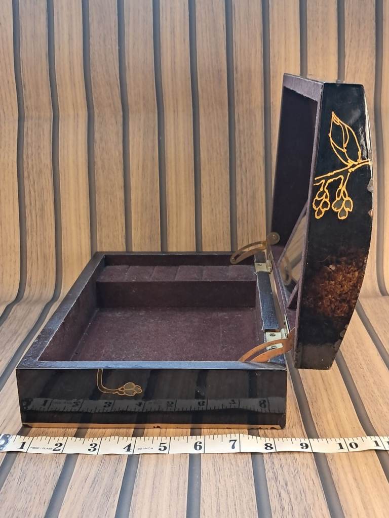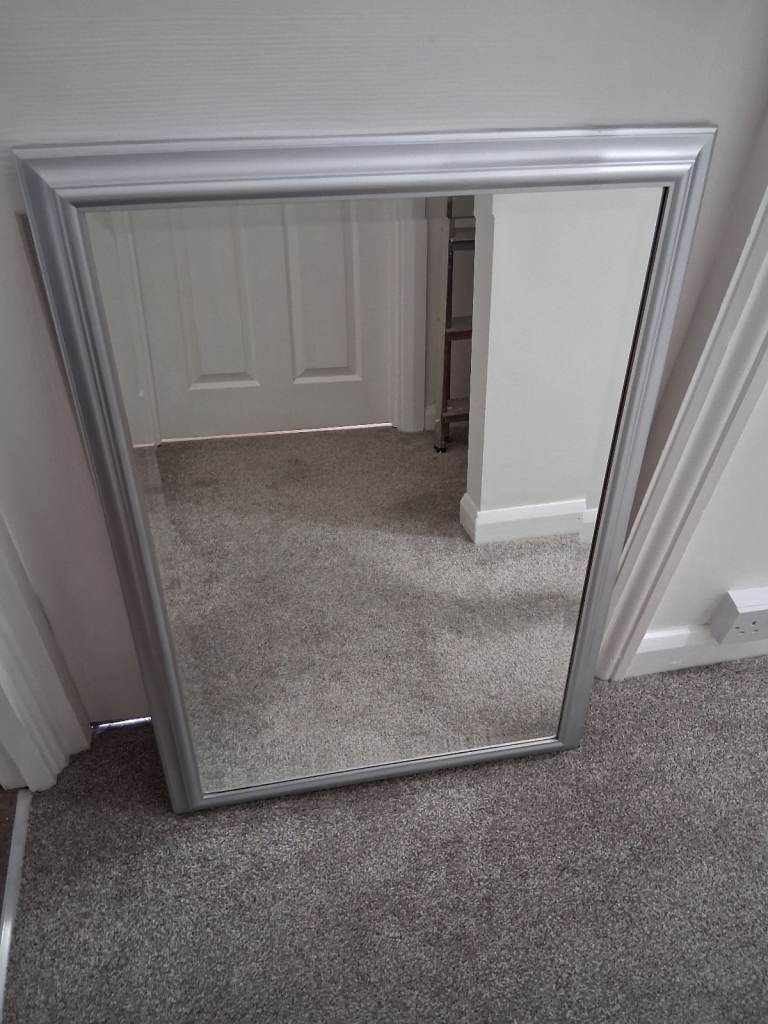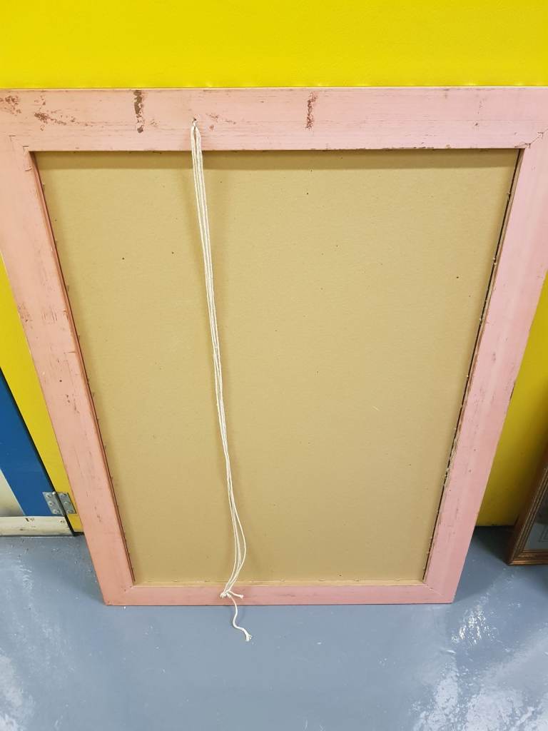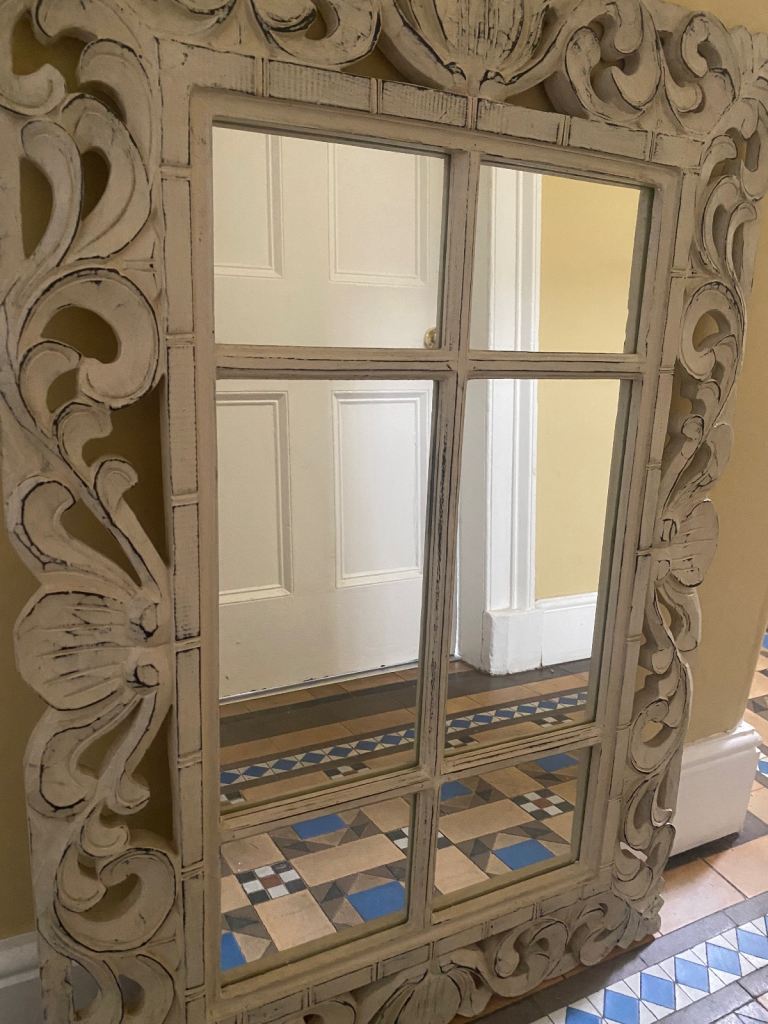 A large ornate vintage rectangular mirror. Wood/Gilt gold frame. 37in(94cm x 27.5in(70cm) Used. Good condition. No chips or cracks in the glass. Some minor signs of wear on the frame.